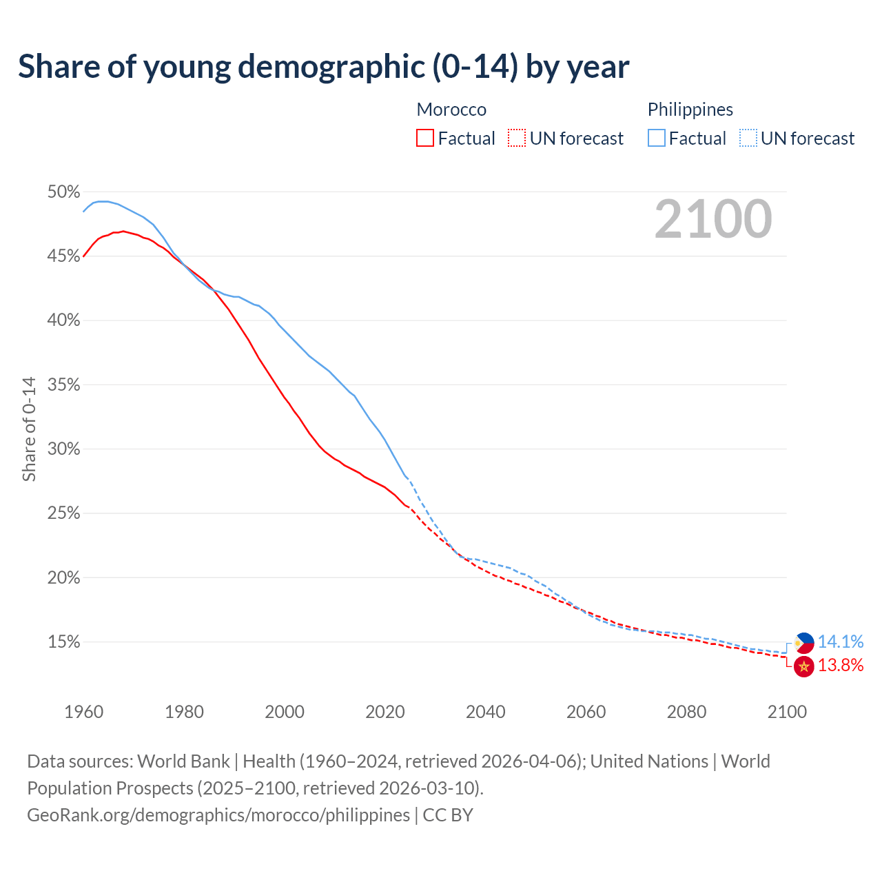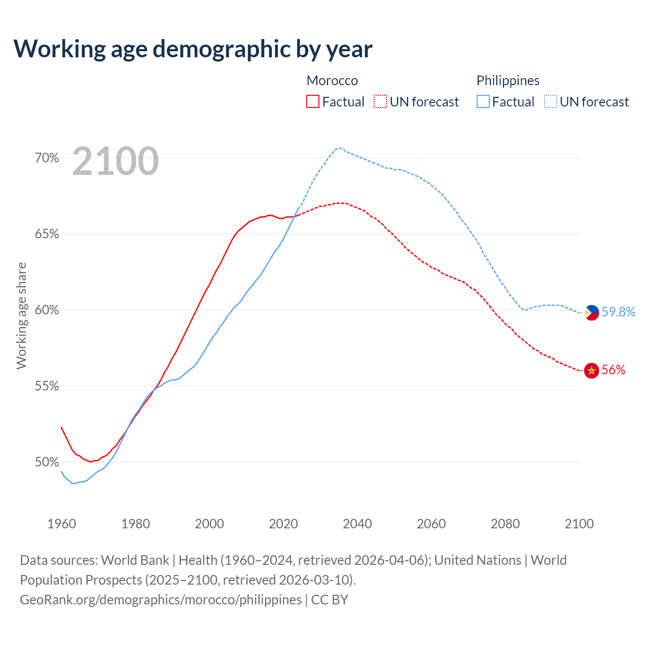 Median age Morocco vs Philippines, 1960-2100