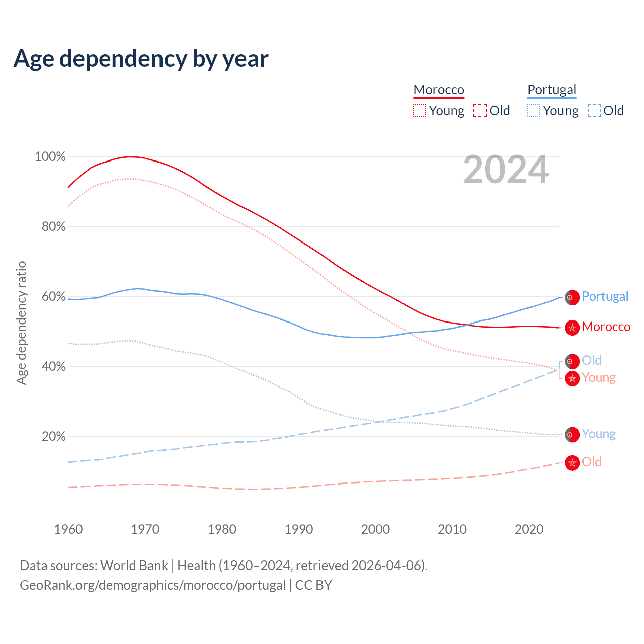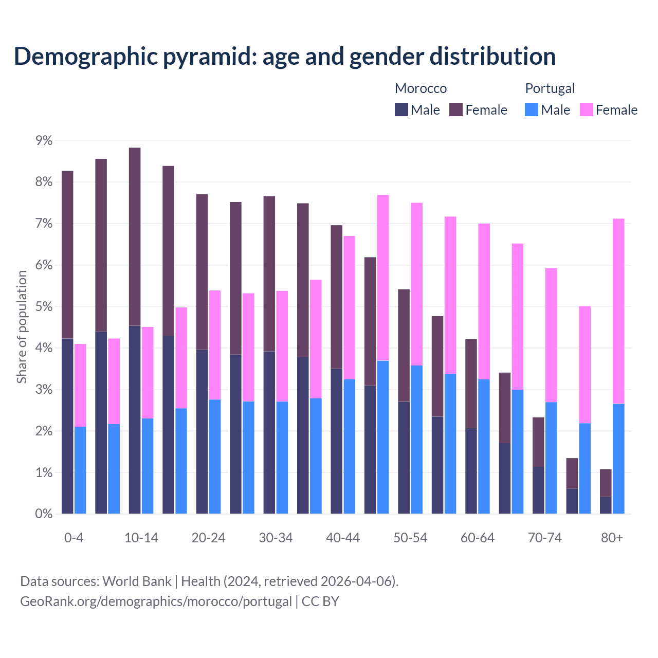 - Morocco is ranked 100/196 by median age (oldest to youngest) vs 5/196 for Portugal.