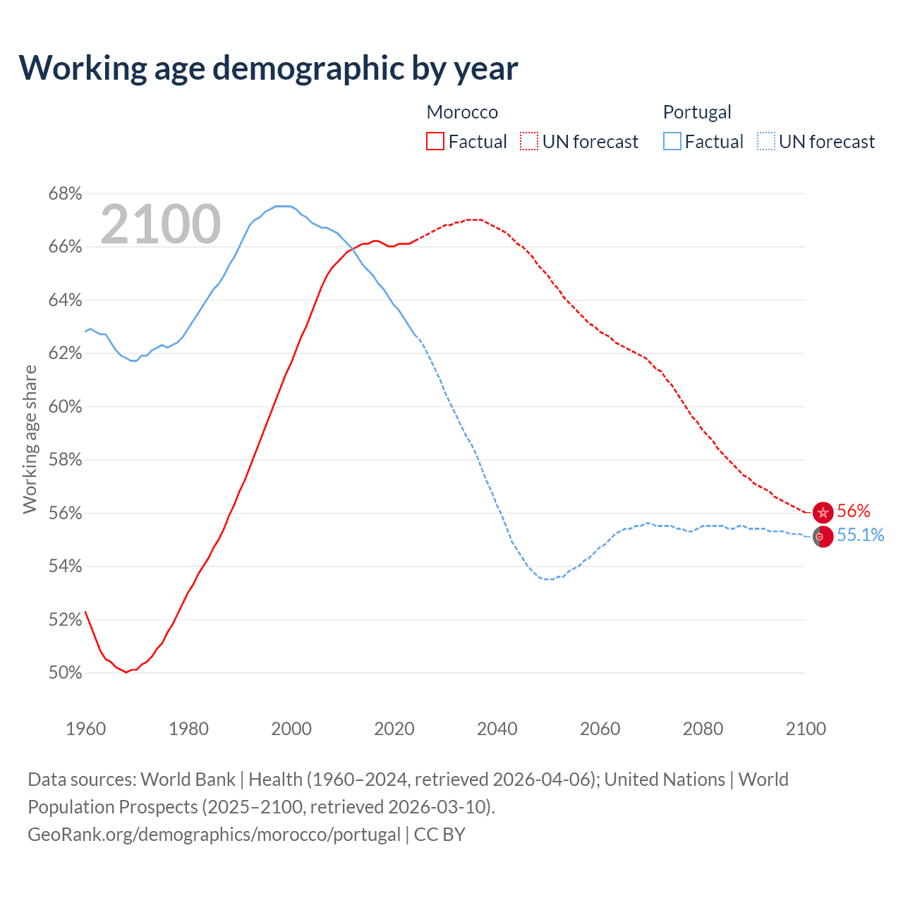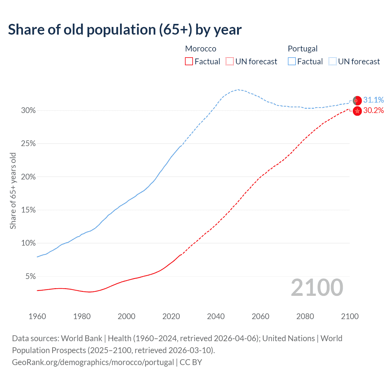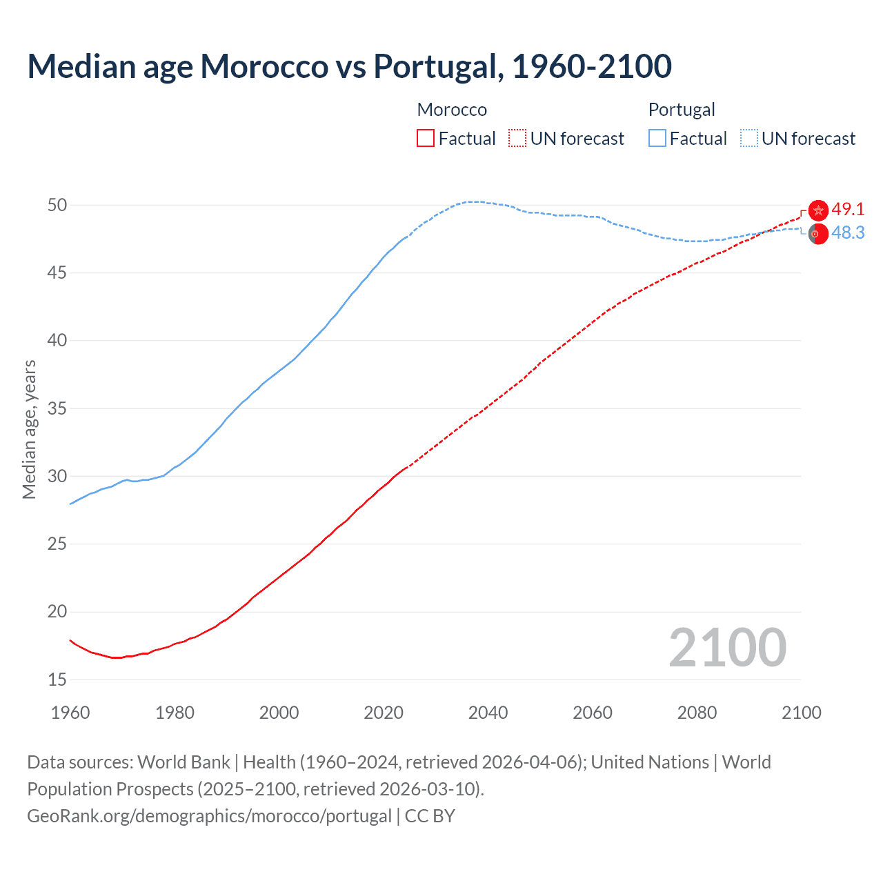 Median age Morocco vs Portugal, 1960-2100