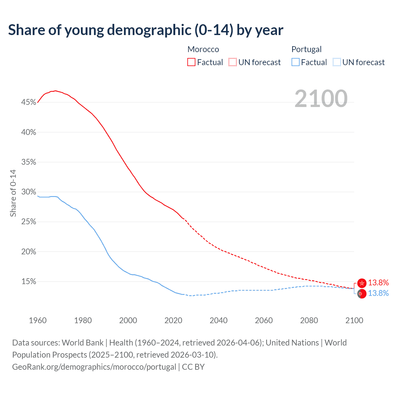 - The share of young demographic (0-15 years old) in Morocco is 25.6% vs 12.8% in Portugal.