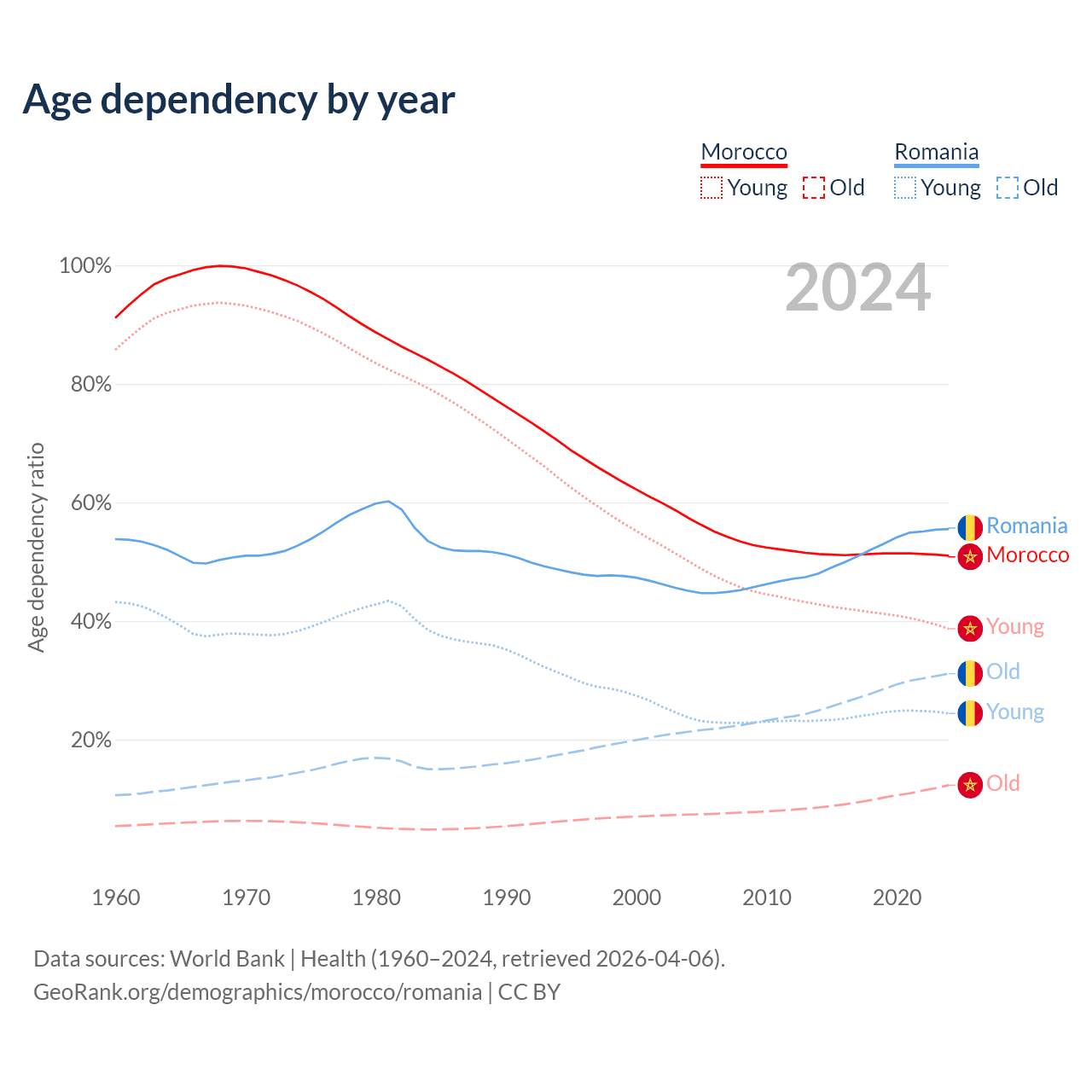 - Morocco is ranked 100/196 by median age (oldest to youngest) vs 23/196 for Romania.