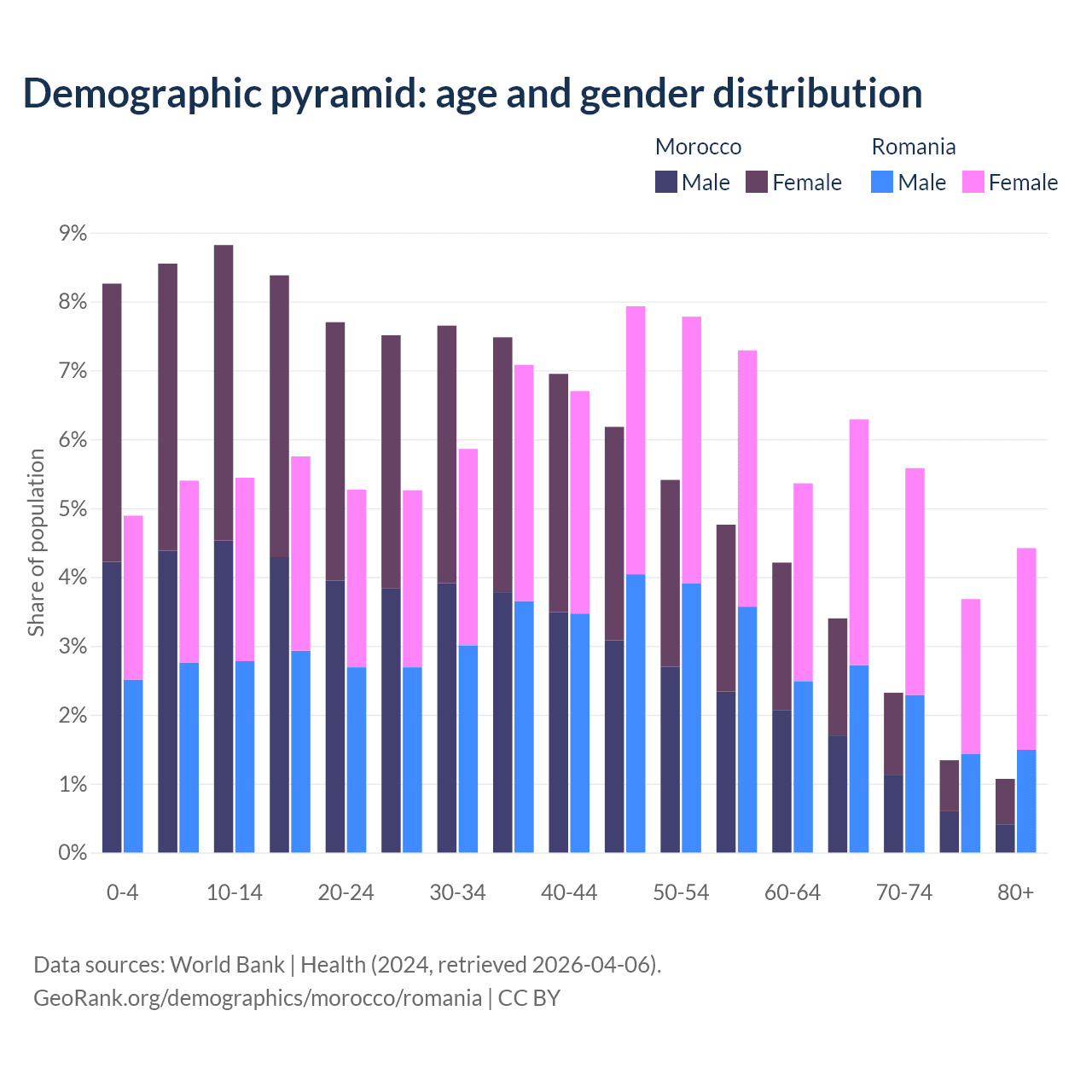 The share of older people aged 65 and over is 8.14% in Morocco and 20% in Romania. Life expectancy in Morocco compared to Romania .