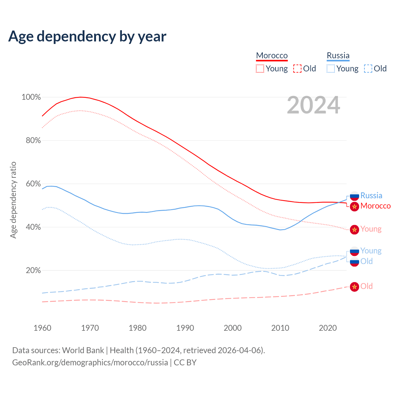 - Morocco is ranked 100/196 by median age (oldest to youngest) vs 42/196 for Russia.