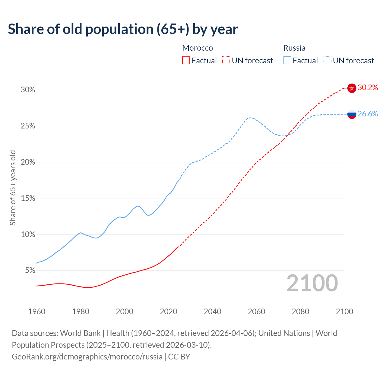The share of older people aged 65 and over is 8.14% in Morocco and 17.2% in Russia. Life expectancy in Morocco compared to Russia .