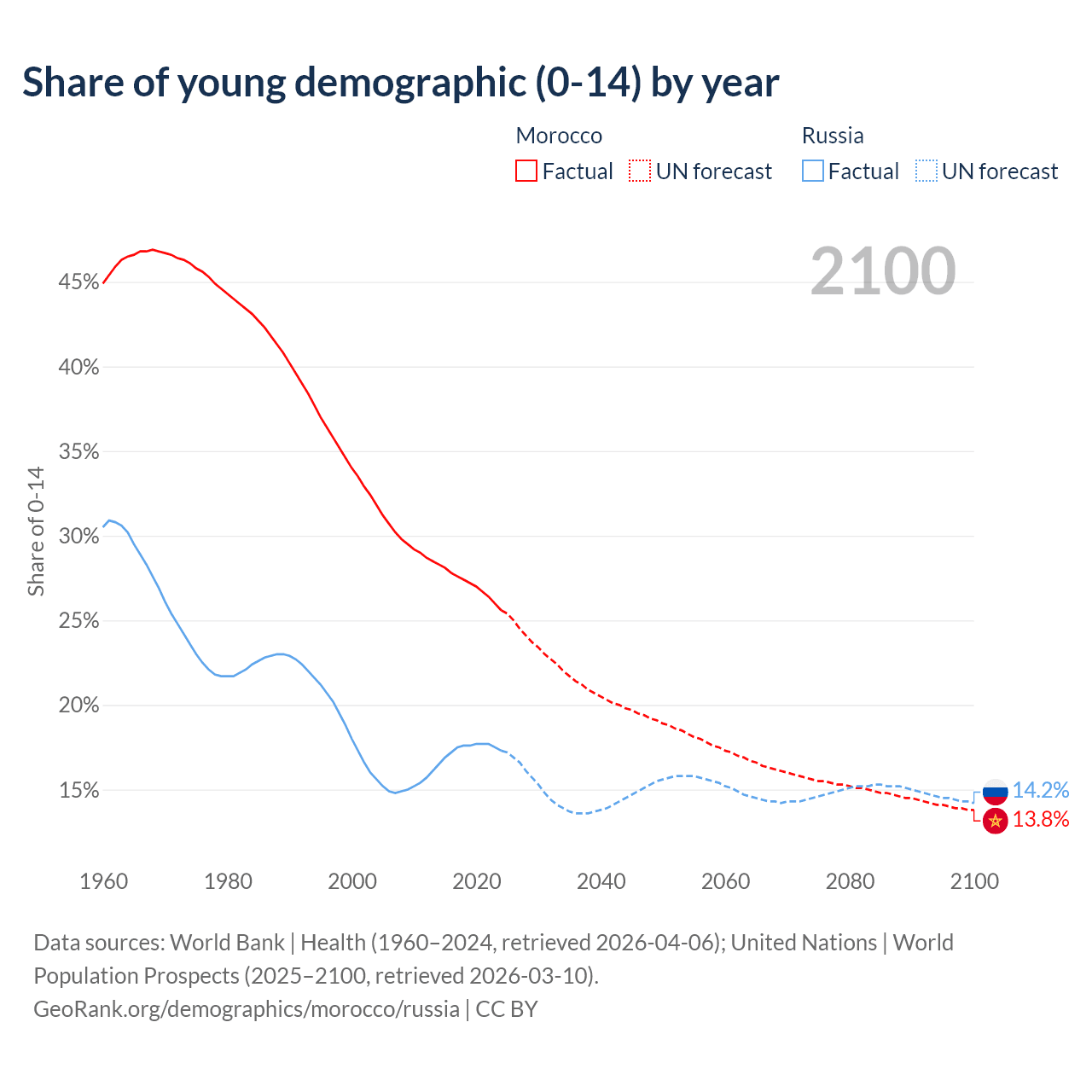 - The share of young demographic (0-15 years old) in Morocco is 25.6% vs 17.3% in Russia.