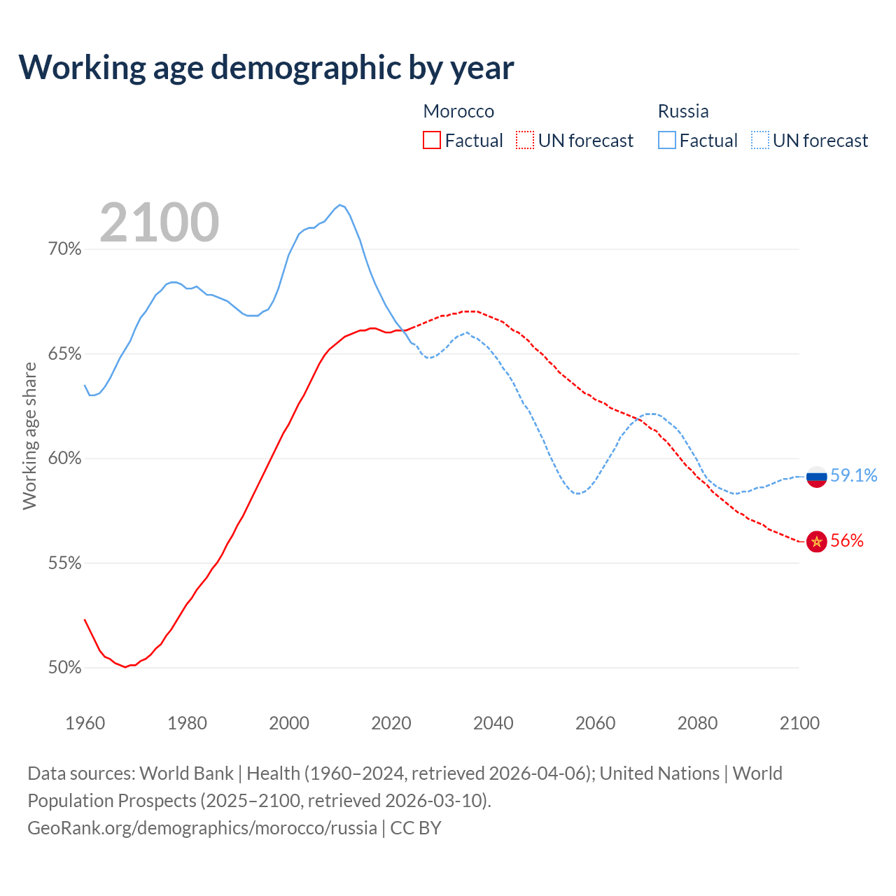 - Morocco has 25.7M working age adults (aged 15-64) vs 93M in Russia.