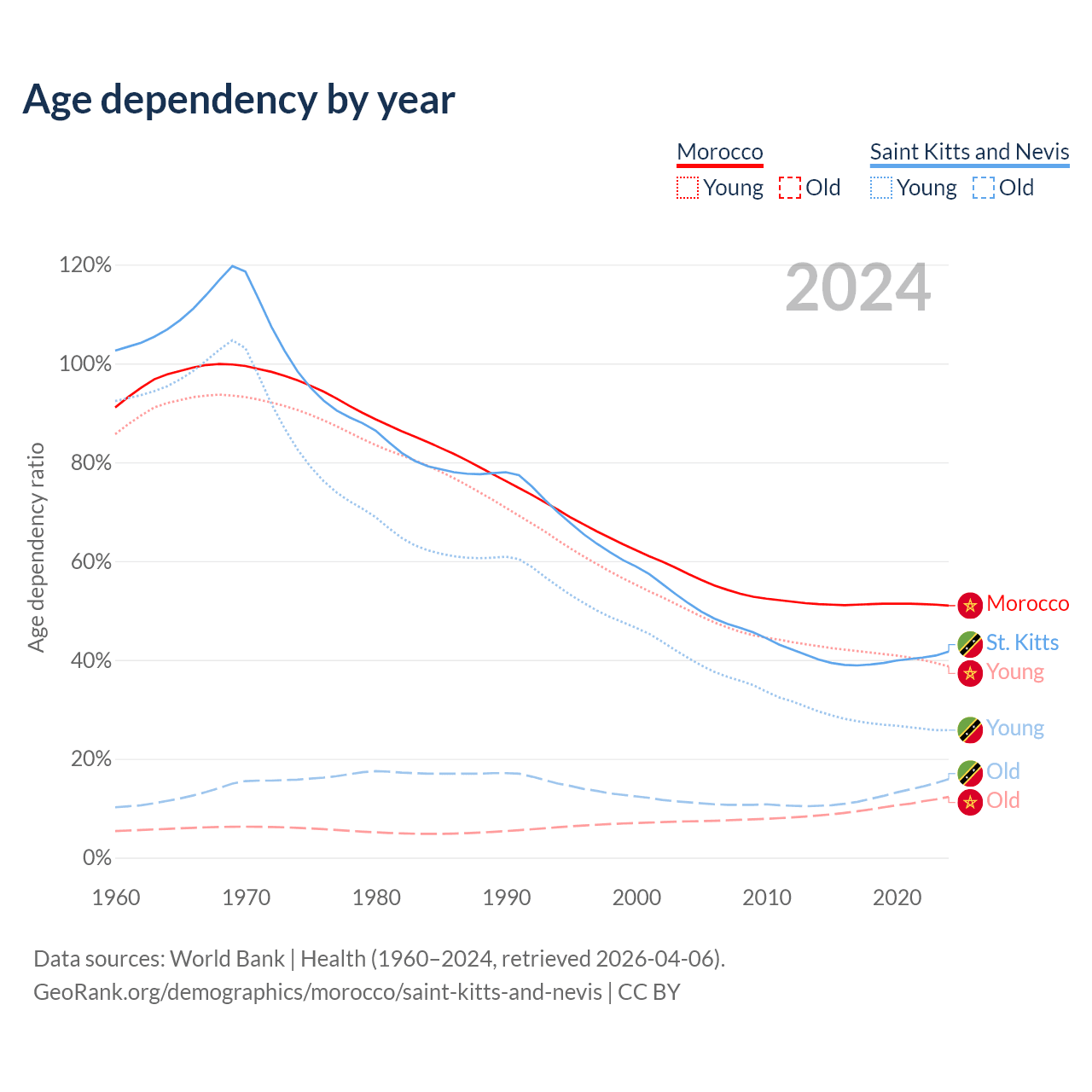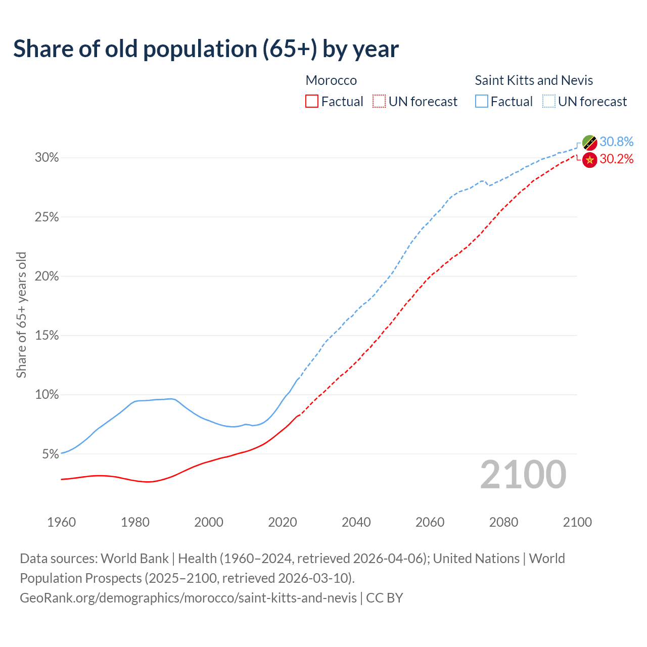 The share of older people aged 65 and over is 8.14% in Morocco and 11.2% in Saint Kitts and Nevis. Life expectancy in Morocco compared to Saint Kitts and Nevis .