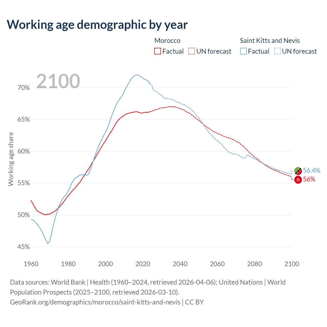 - Morocco has 25.7M working age adults (aged 15-64) vs 33.2K in Saint Kitts and Nevis.