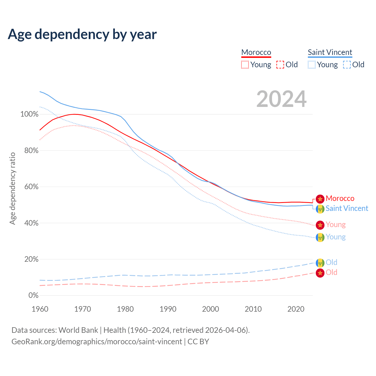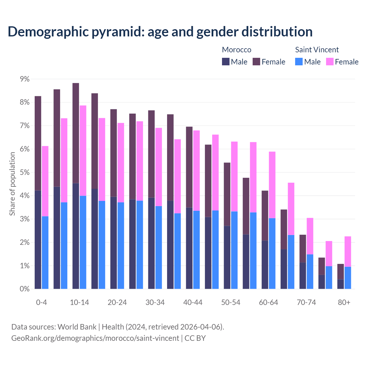- The share of young demographic (0-15 years old) in Morocco is 25.6% vs 21.3% in Saint Vincent.