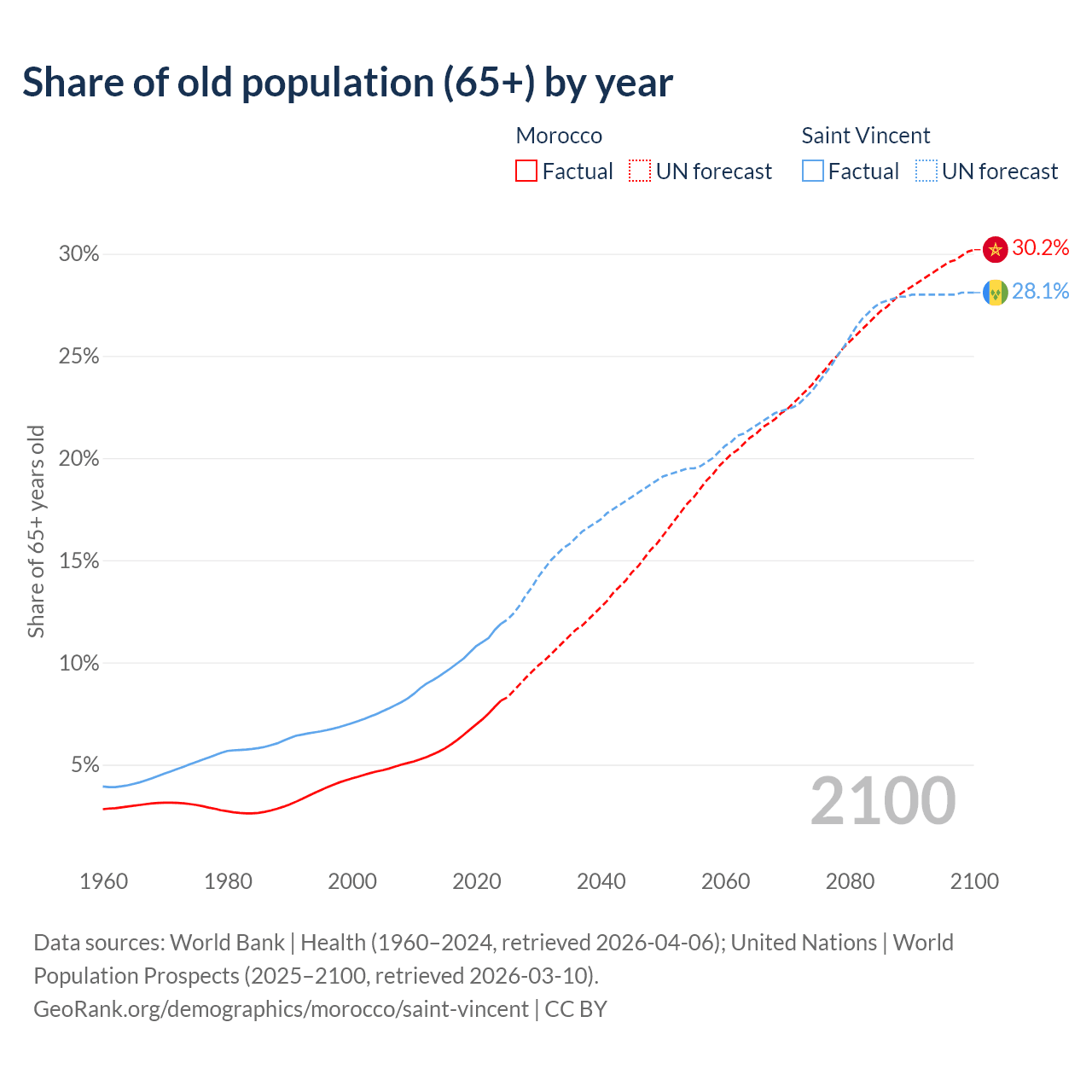 - The share of old-age demographic (65+) in Morocco is 8.14% vs 11.9% in Saint Vincent.