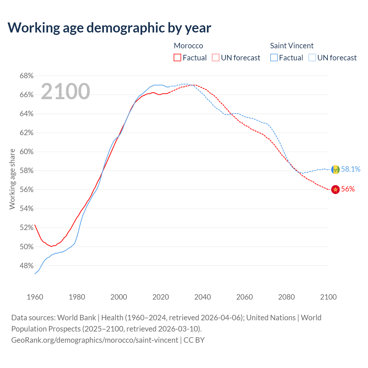 - Morocco has 25.7M working age adults (aged 15-64) vs 66.3K in Saint Vincent.