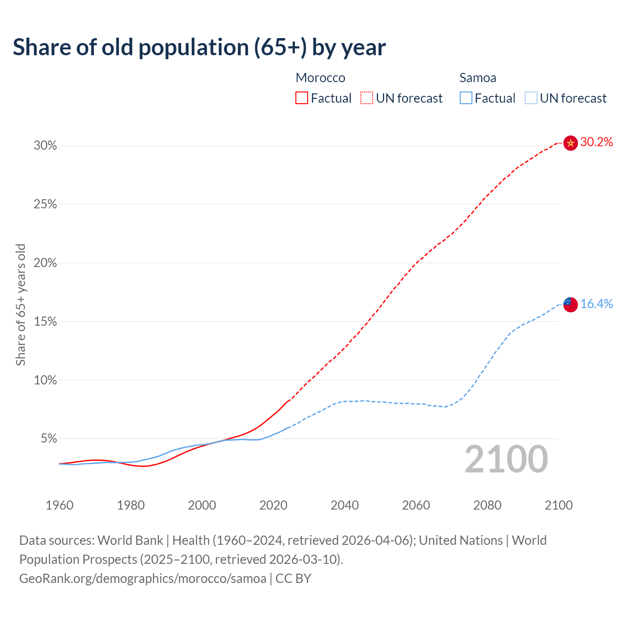 The share of older people aged 65 and over is 8.14% in Morocco and 5.88% in Samoa. Life expectancy in Morocco compared to Samoa .