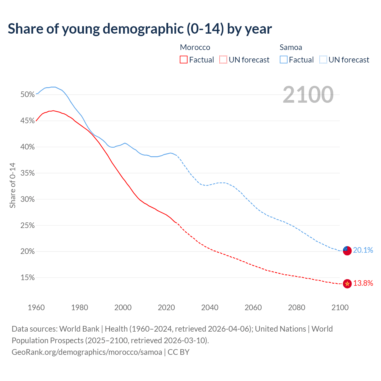 - The share of young demographic (0-15 years old) in Morocco is 25.6% vs 38.5% in Samoa.