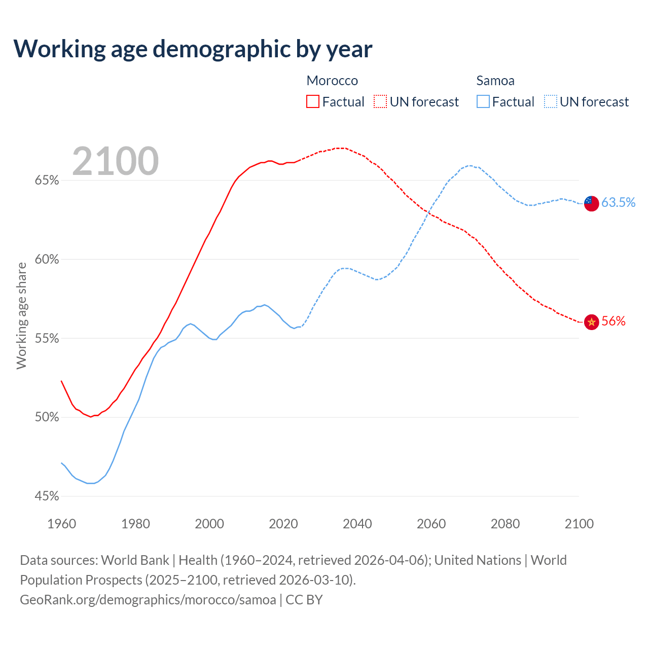 - Morocco has 25.7M working age adults (aged 15-64) vs 123K in Samoa.