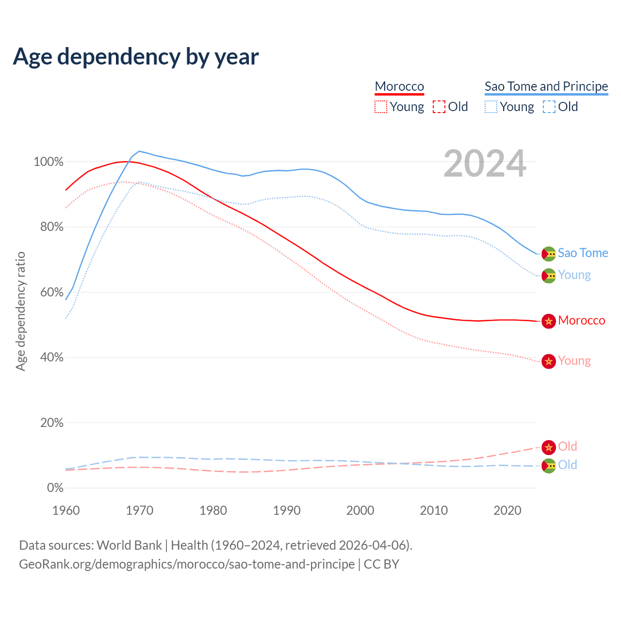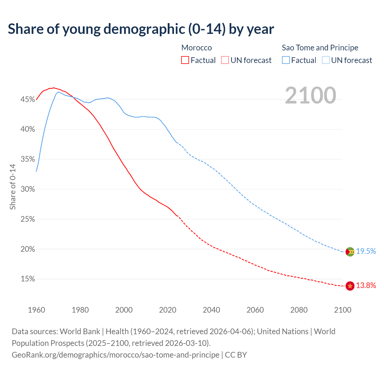 - The share of young demographic (0-15 years old) in Morocco is 25.6% vs 37.8% in Sao Tome and Principe.