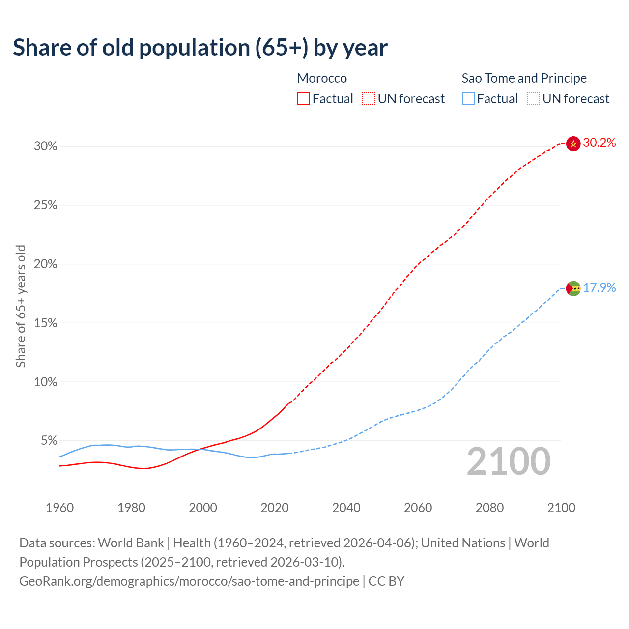 The share of older people aged 65 and over is 8.14% in Morocco and 3.9% in Sao Tome and Principe. Life expectancy in Morocco compared to Sao Tome and Principe .