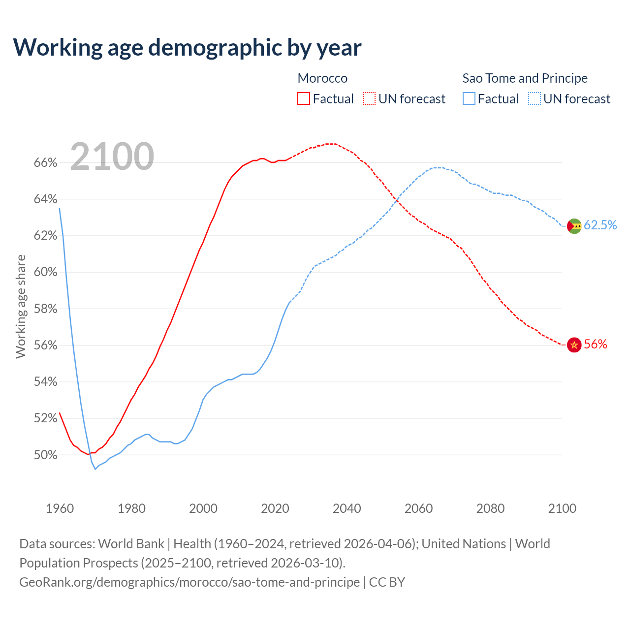 Median age Morocco vs Sao Tome and Principe, 1960-2100