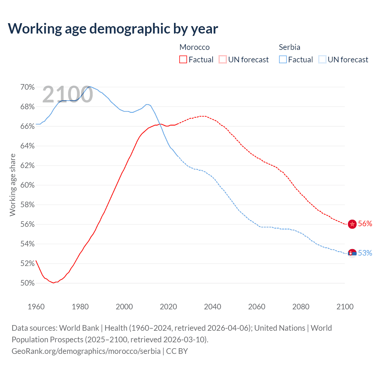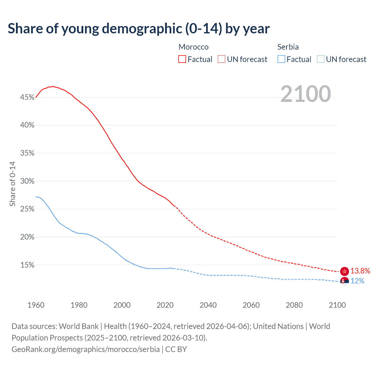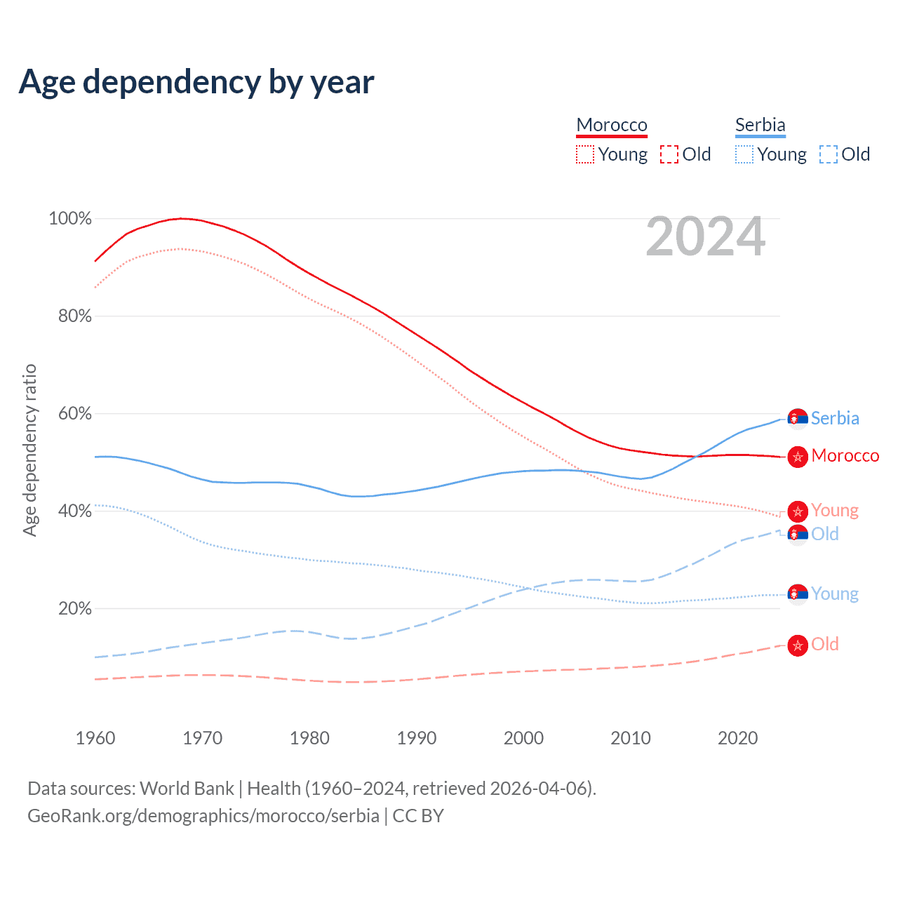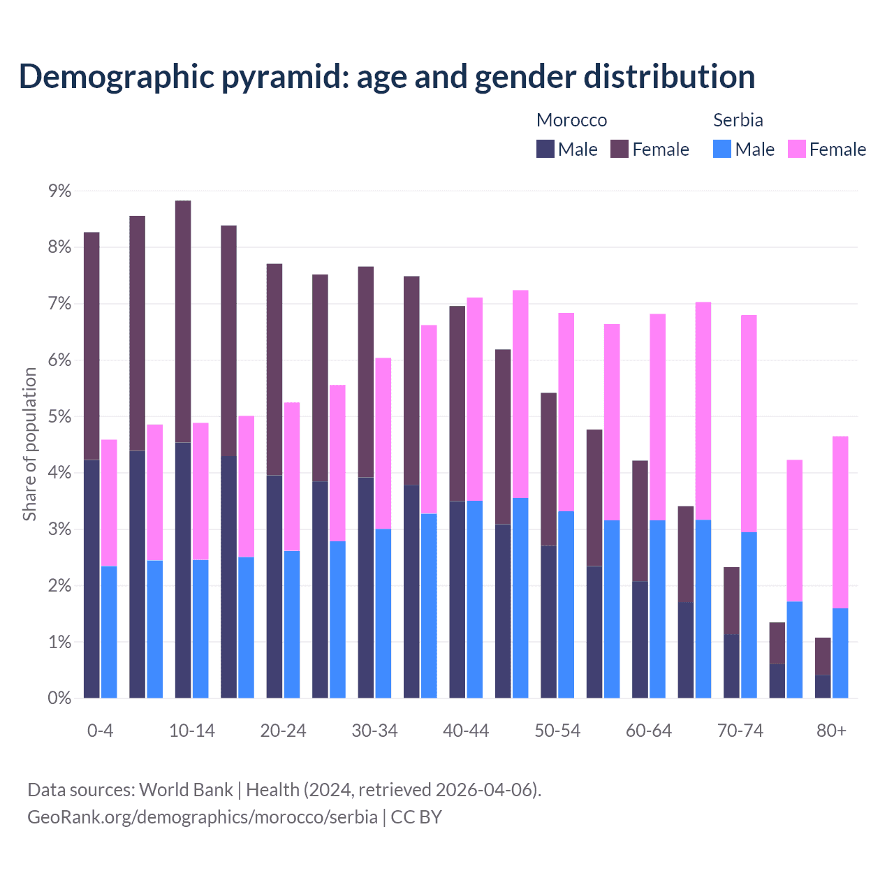 - Morocco is ranked 100/196 by median age (oldest to youngest) vs 15/196 for Serbia.
