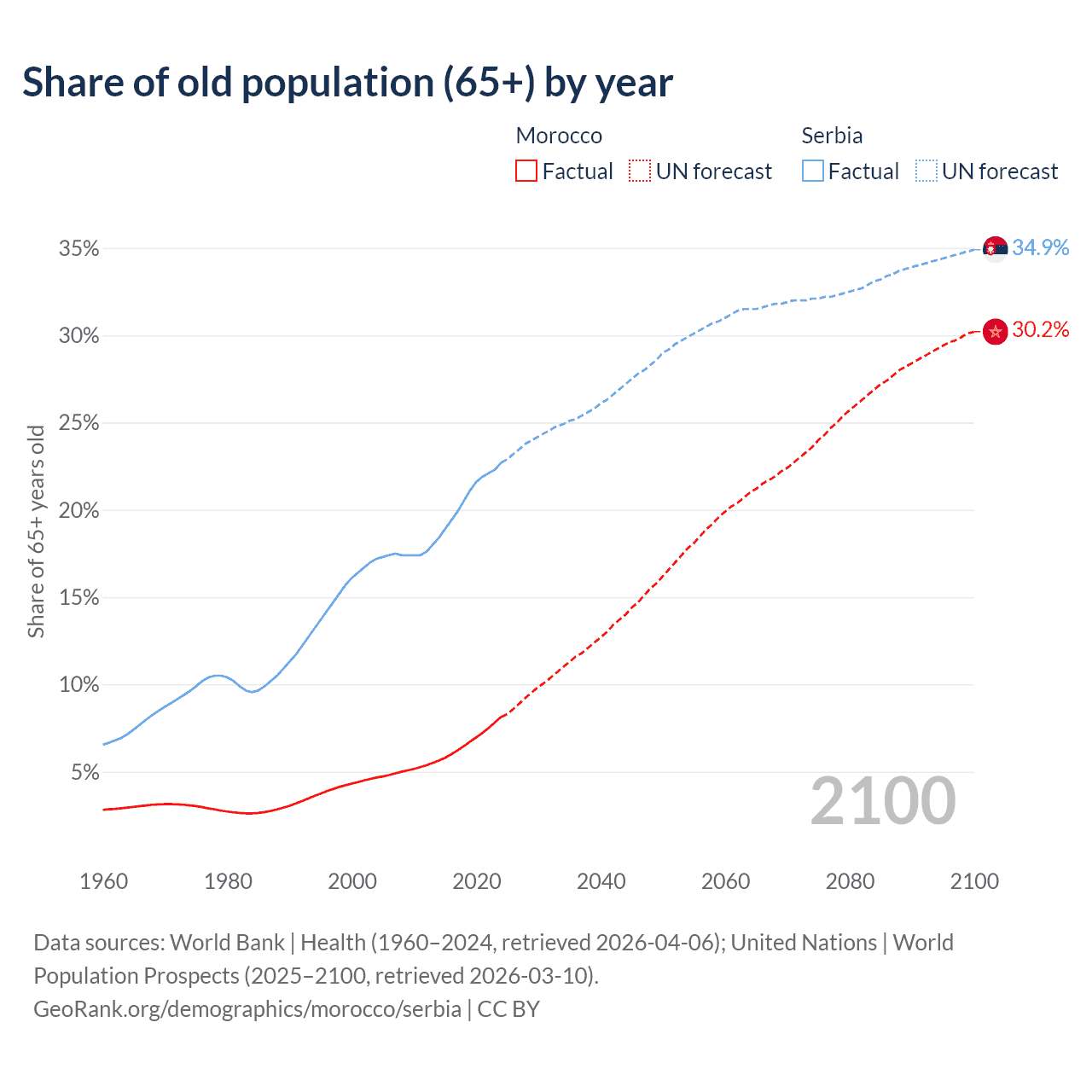 The share of older people aged 65 and over is 8.14% in Morocco and 22.7% in Serbia. Life expectancy in Morocco compared to Serbia .