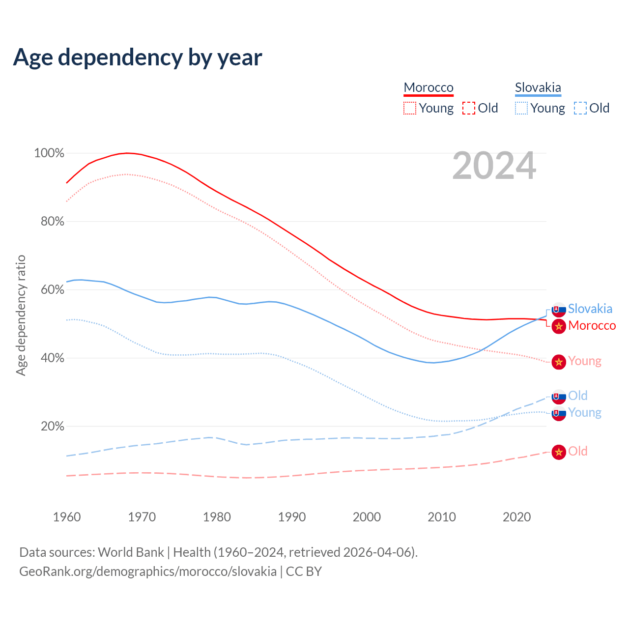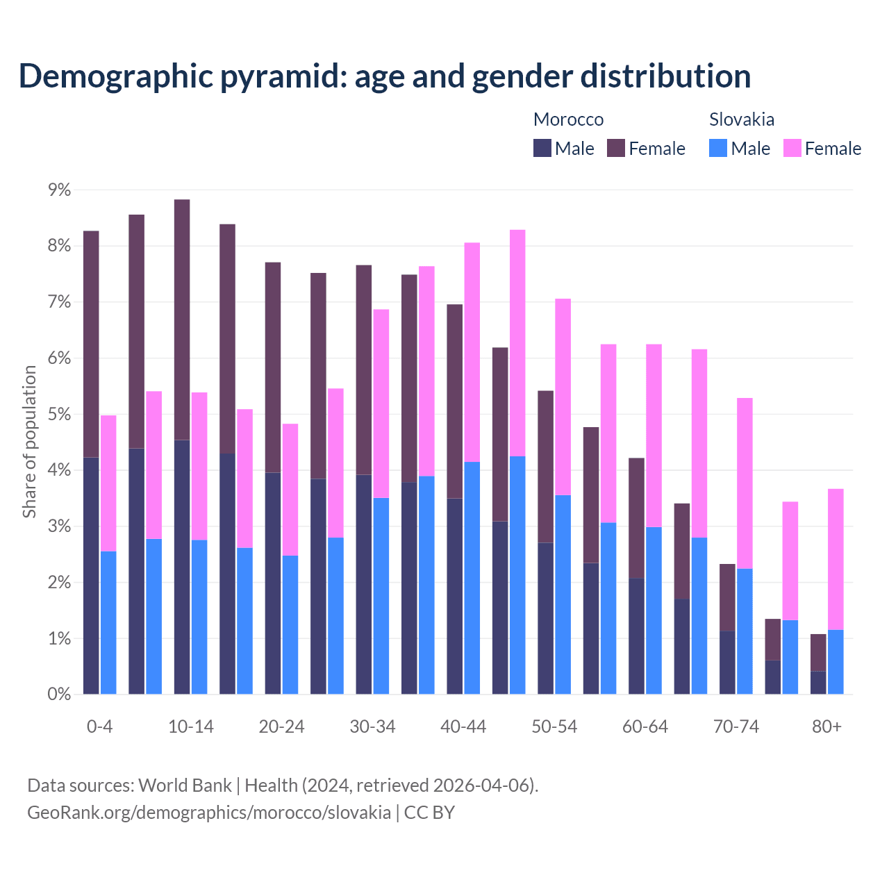 - Morocco is ranked 100/196 by median age (oldest to youngest) vs 31/196 for Slovakia.