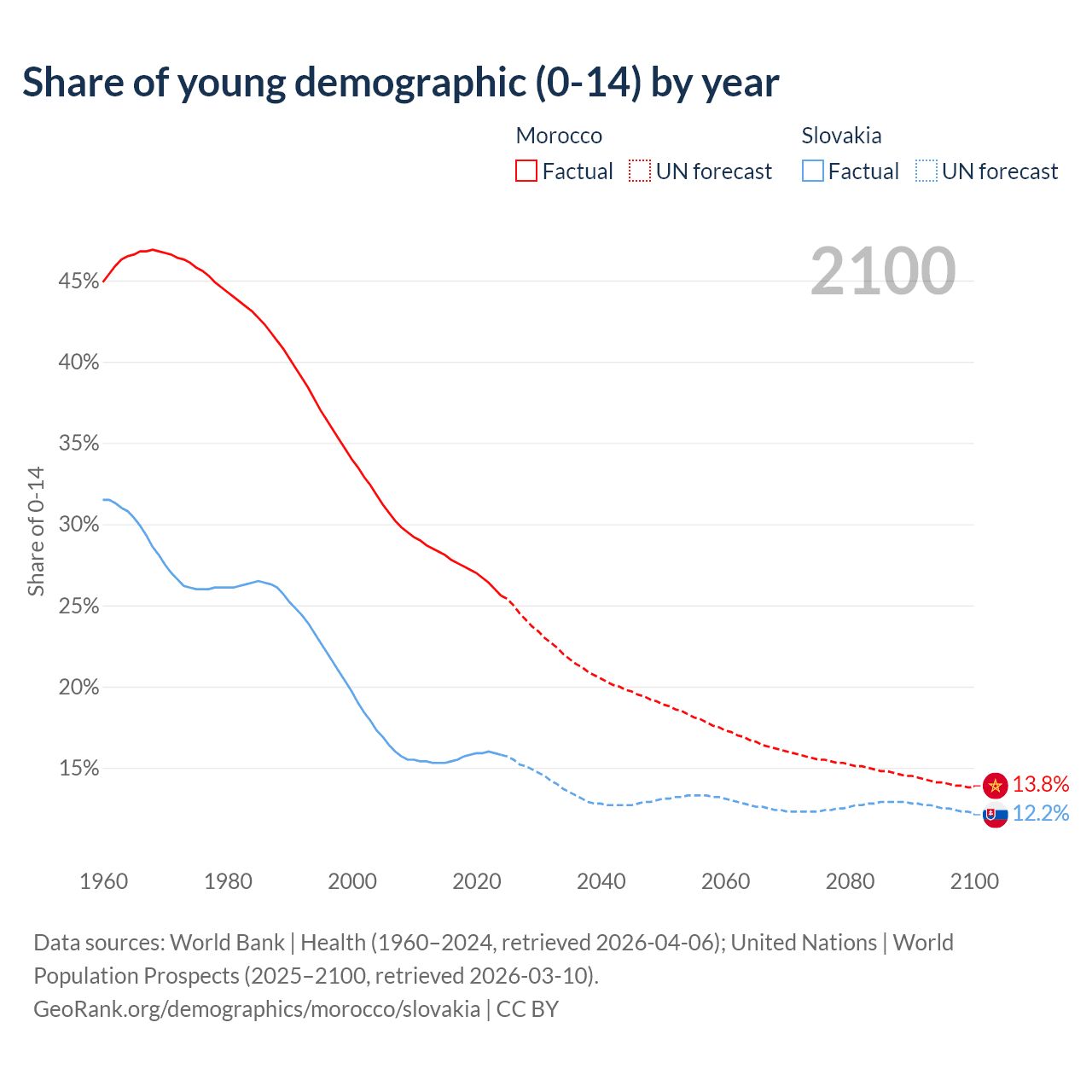- The share of young demographic (0-15 years old) in Morocco is 25.6% vs 15.8% in Slovakia.