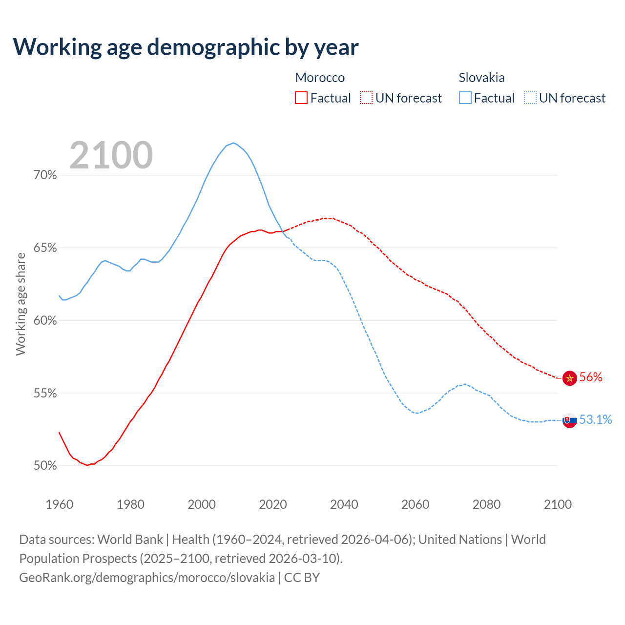 Median age Morocco vs Slovakia, 1960-2100