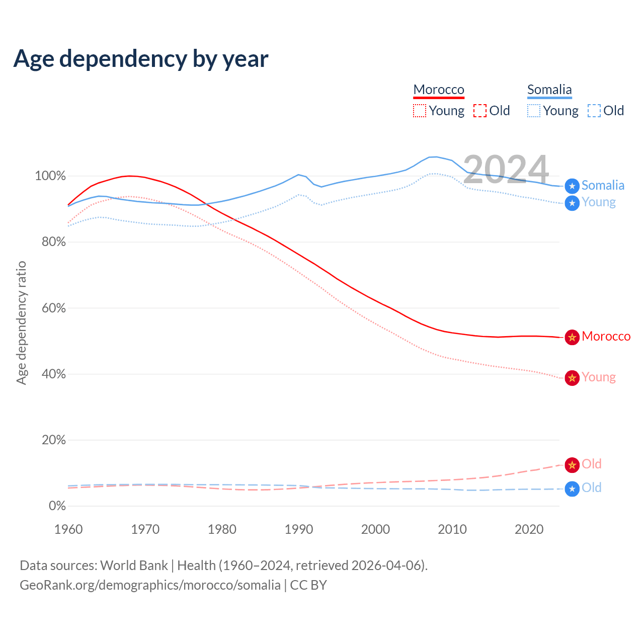 - Morocco is ranked 100/196 by median age (oldest to youngest) vs 194/196 for Somalia.