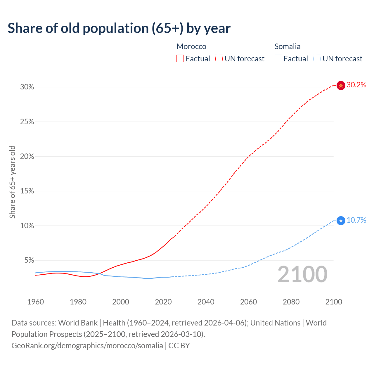 The share of older people aged 65 and over is 8.14% in Morocco and 2.59% in Somalia. Life expectancy in Morocco compared to Somalia .