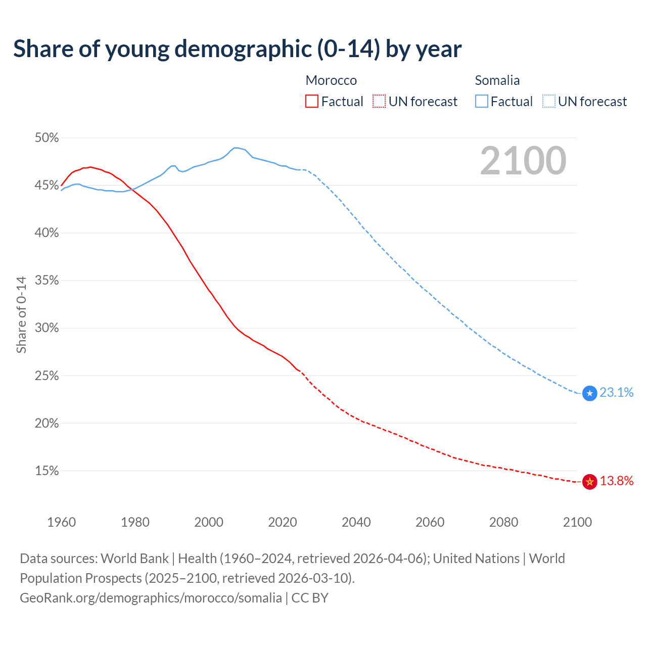 - The share of young demographic (0-15 years old) in Morocco is 25.6% vs 46.6% in Somalia.