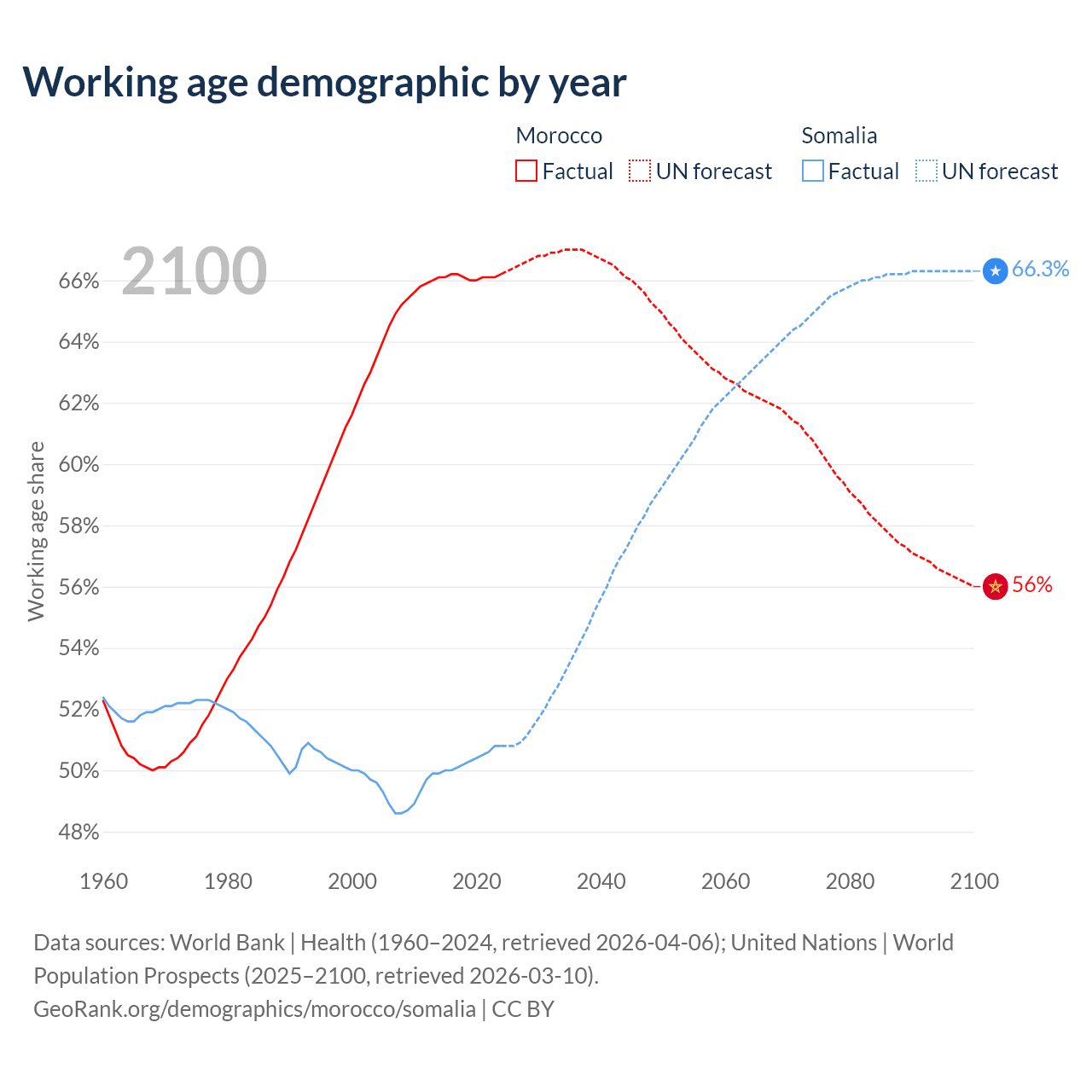 - Morocco has 25.7M working age adults (aged 15-64) vs 10.4M in Somalia.