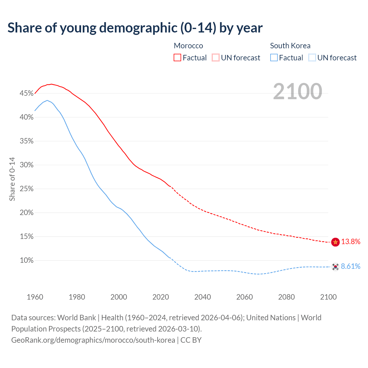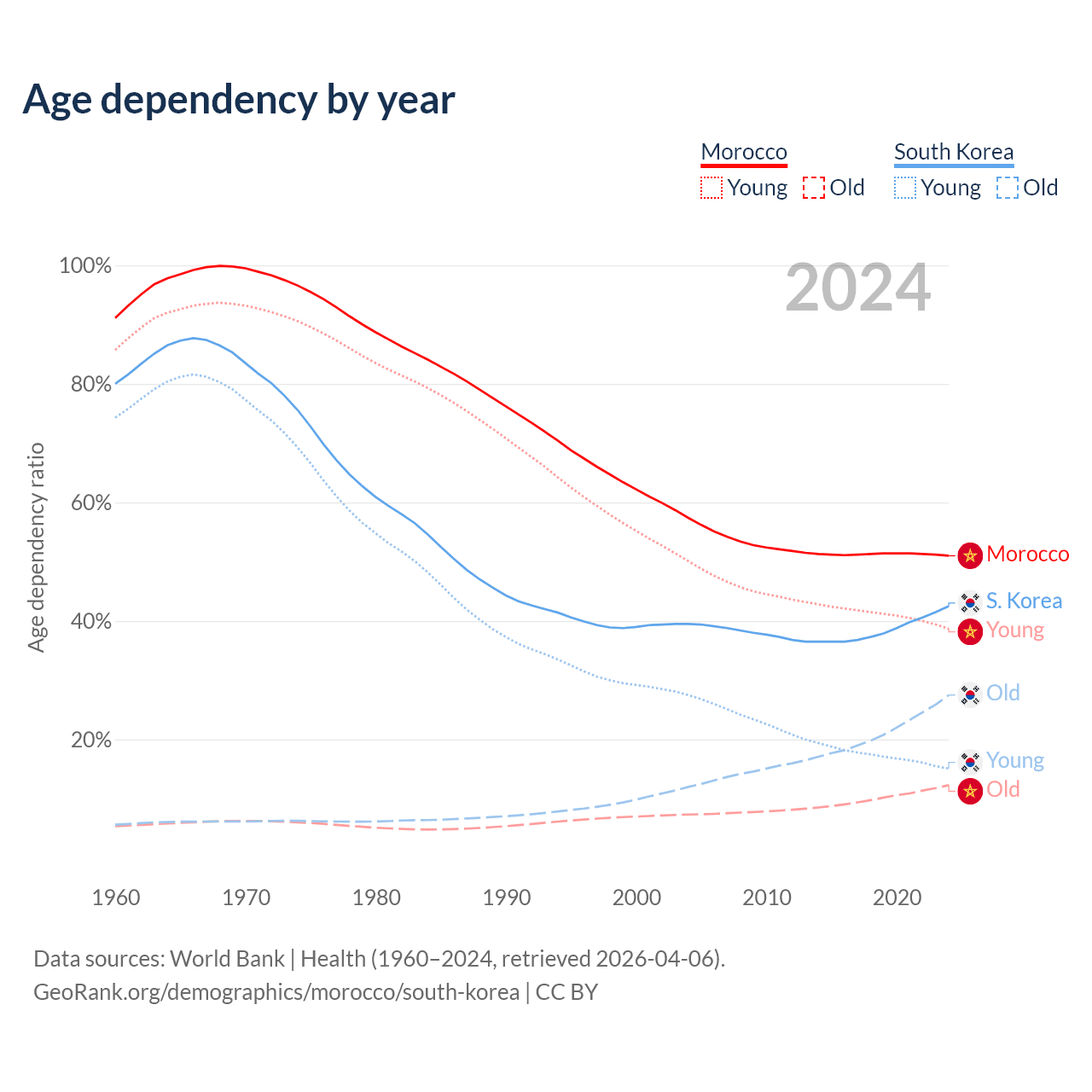 - Morocco is ranked 100/196 by median age (oldest to youngest) vs 10/196 for South Korea.