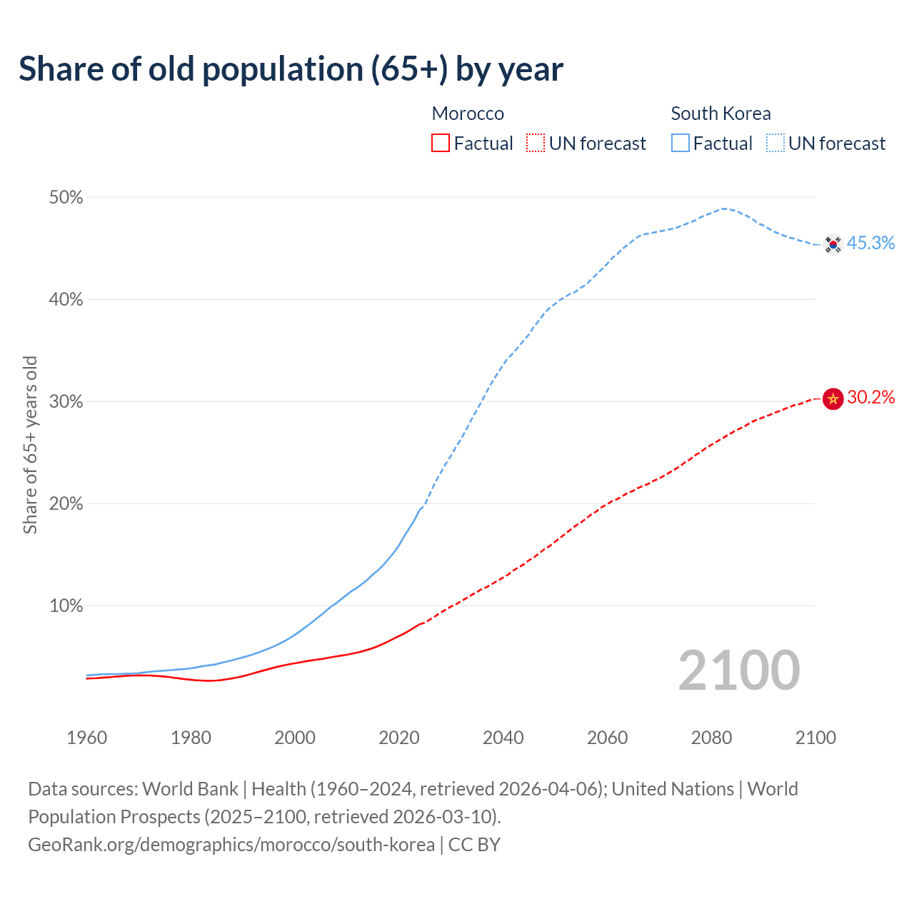 The share of older people aged 65 and over is 8.14% in Morocco and 19.3% in South Korea. Life expectancy in Morocco compared to South Korea .