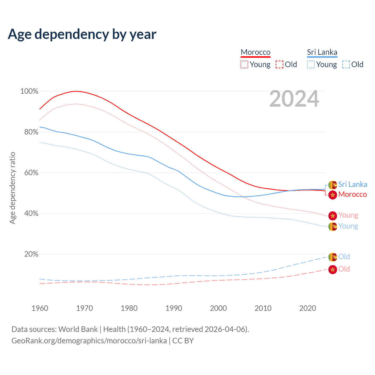 - Morocco is ranked 100/196 by median age (oldest to youngest) vs 81/196 for Sri Lanka.