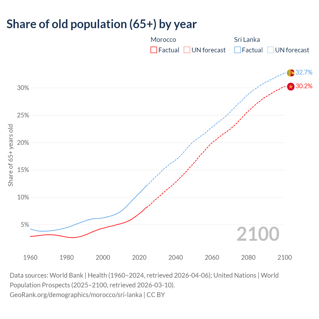 The share of older people aged 65 and over is 8.14% in Morocco and 12.1% in Sri Lanka. Life expectancy in Morocco compared to Sri Lanka .