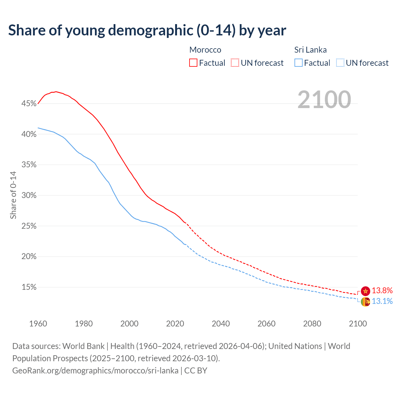 - As of 2026, the population of Morocco is 38.9M vs 22.2M in Sri Lanka - 1.75 times difference.