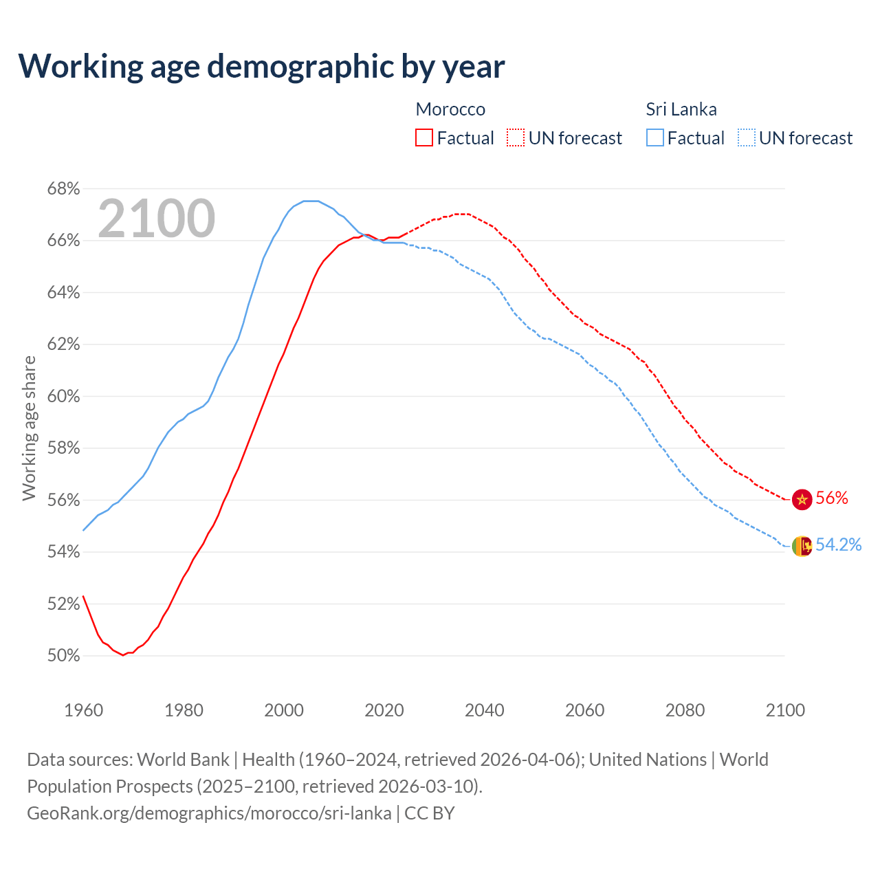 - Morocco has 25.7M working age adults (aged 15-64) vs 14.6M in Sri Lanka.