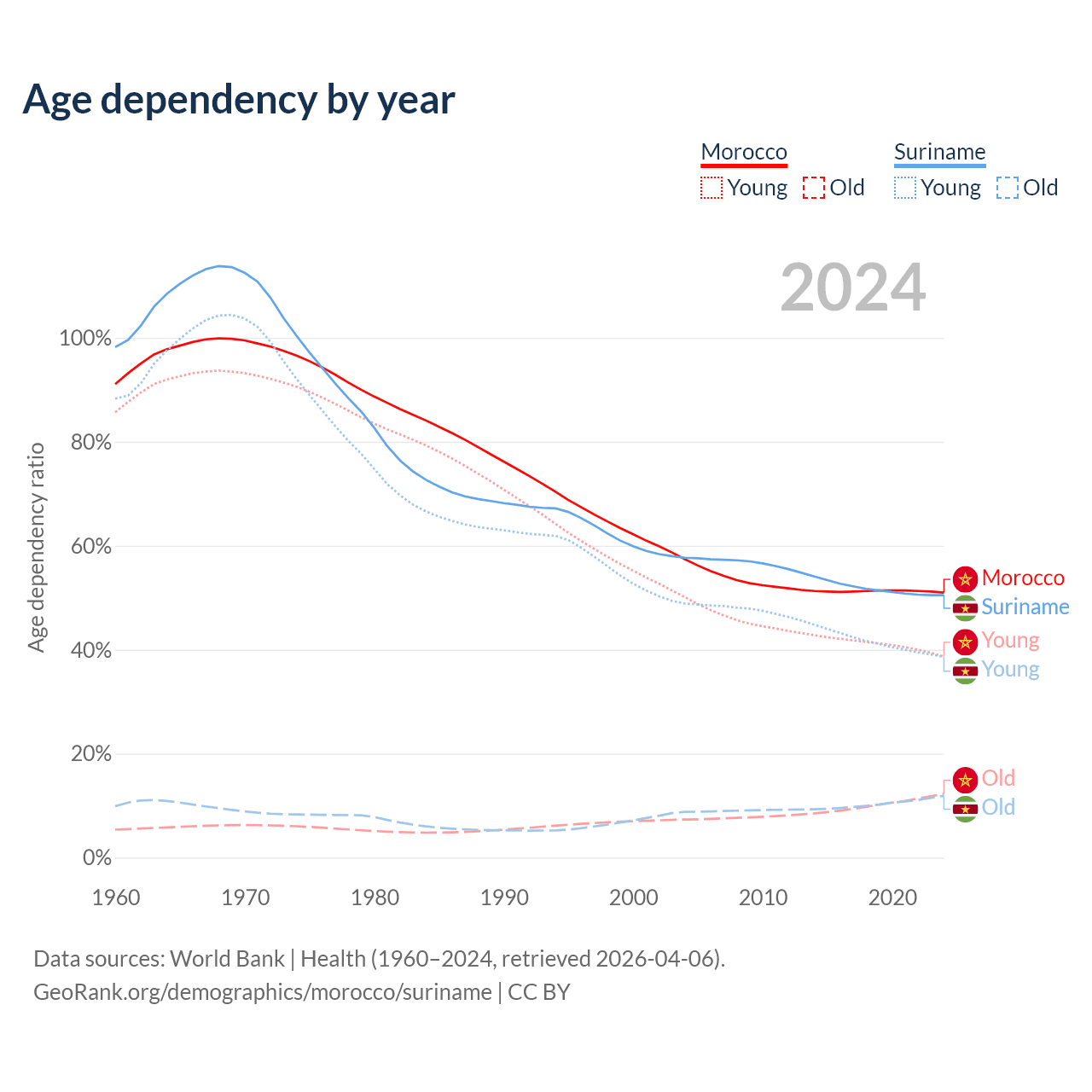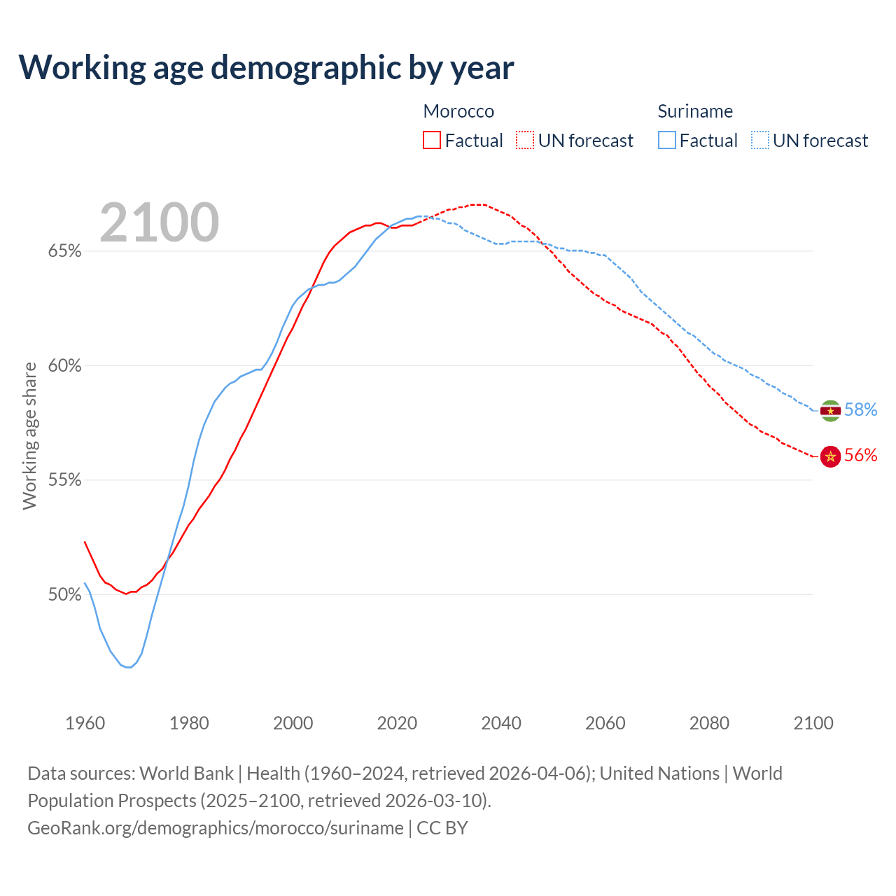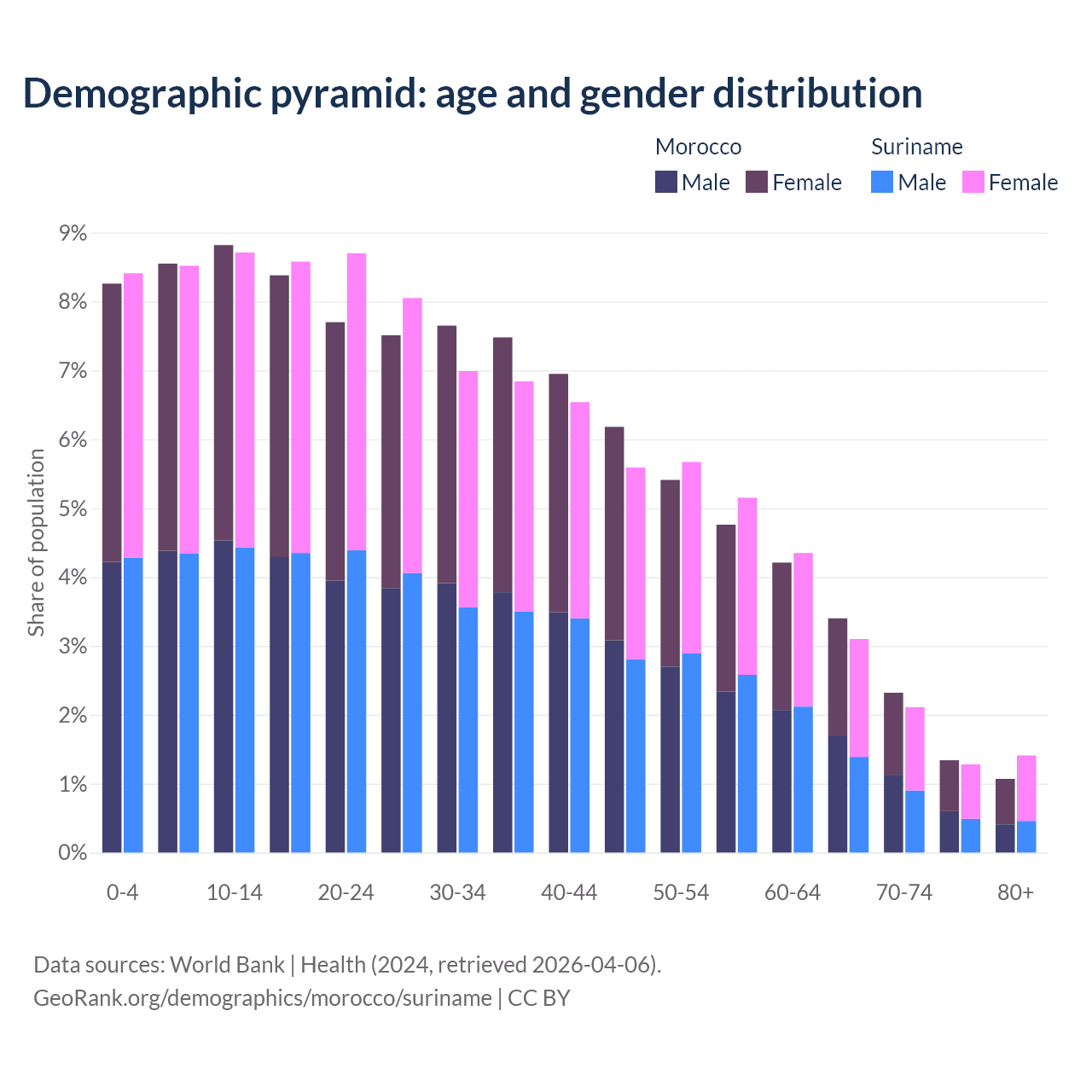 - The share of young demographic (0-15 years old) in Morocco is 25.6% vs 25.6% in Suriname.