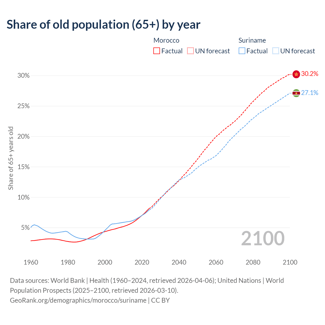 The share of older people aged 65 and over is 8.14% in Morocco and 7.9% in Suriname. Life expectancy in Morocco compared to Suriname .