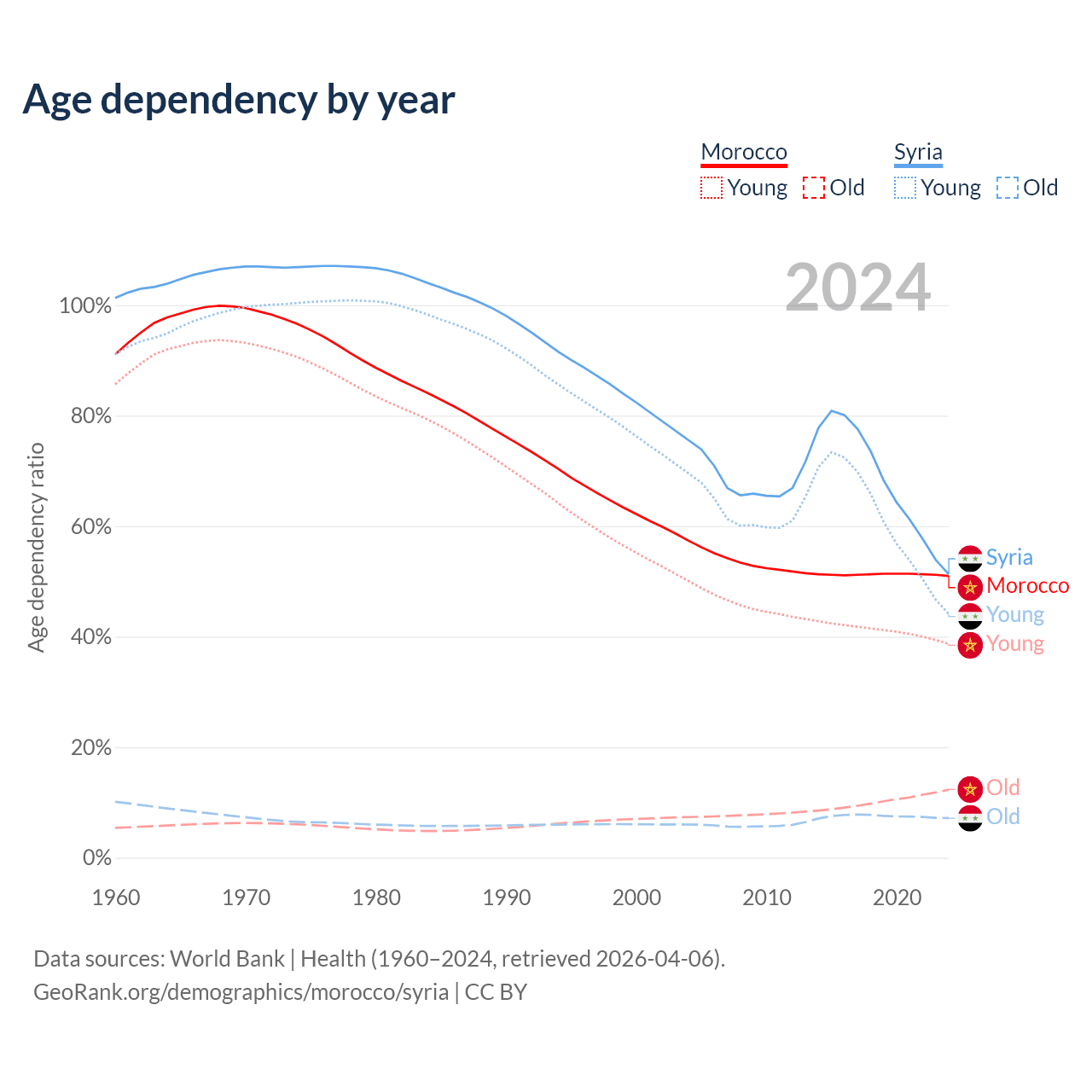 - Morocco is ranked 100/196 by median age (oldest to youngest) vs 138/196 for Syria.