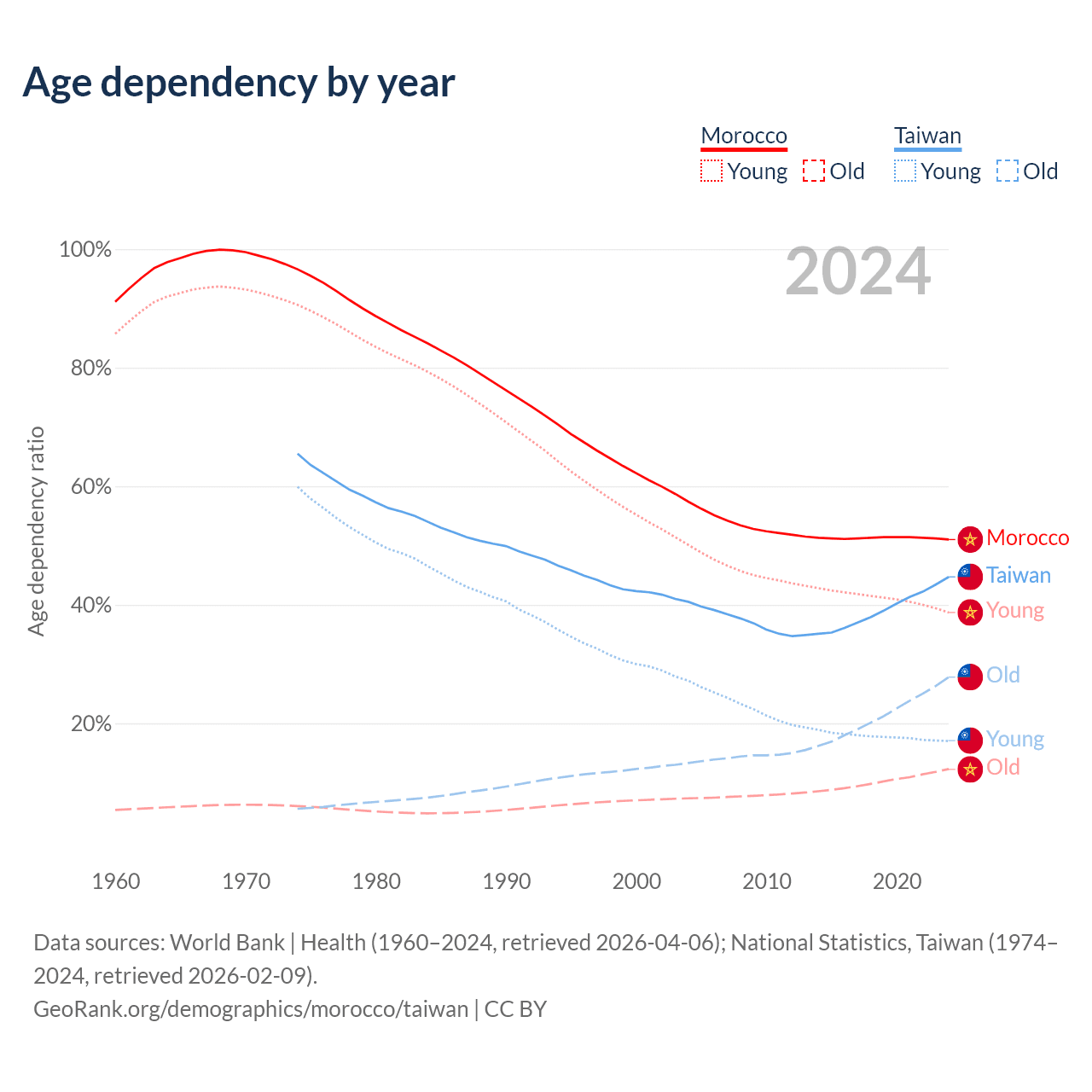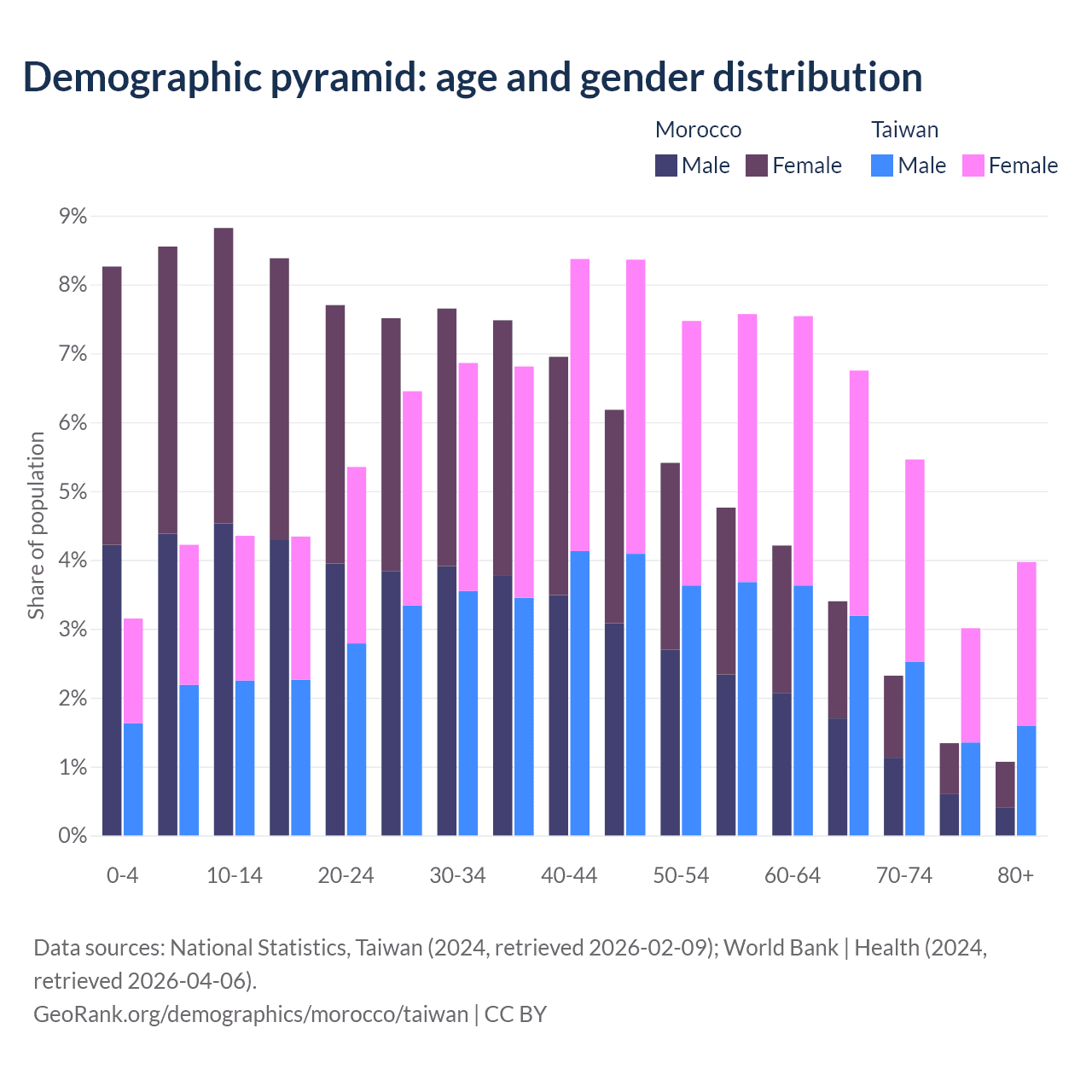 - Morocco is ranked 100/196 by median age (oldest to youngest) vs 16/196 for Taiwan.