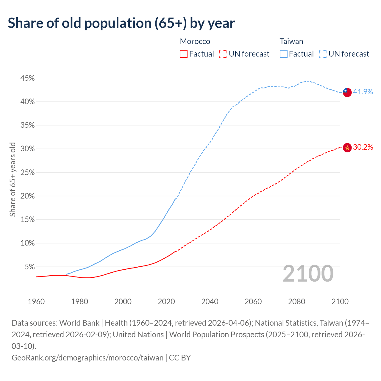 The share of older people aged 65 and over is 8.14% in Morocco and 19.2% in Taiwan. Life expectancy in Morocco compared to Taiwan .