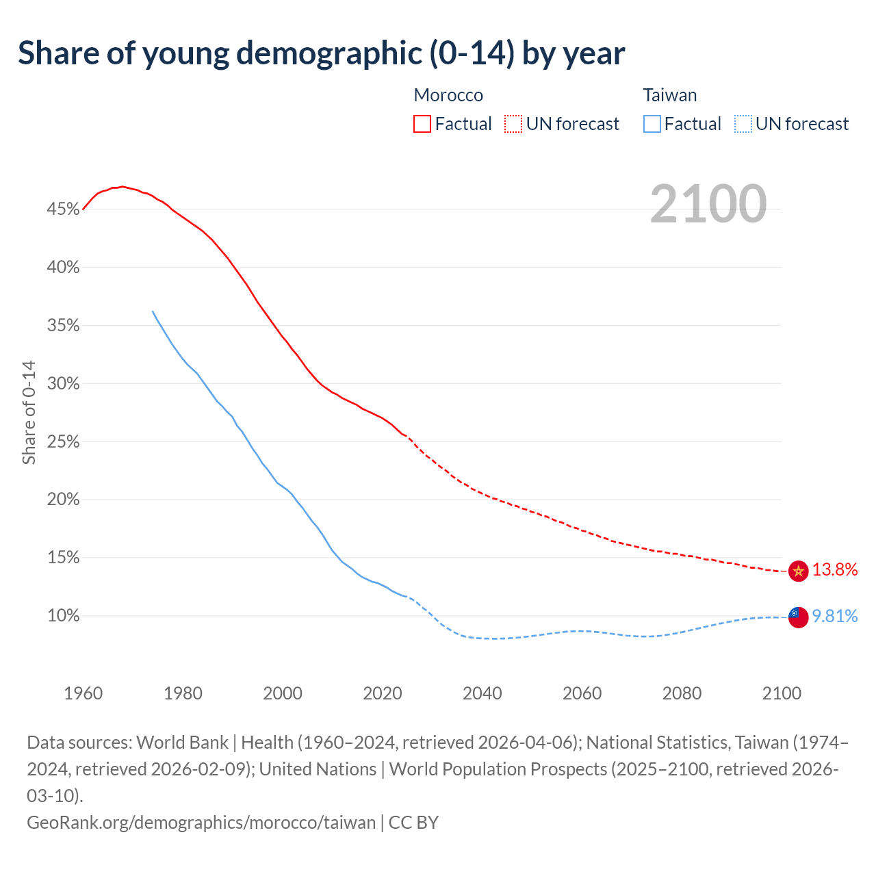 - The share of young demographic (0-15 years old) in Morocco is 25.6% vs 11.7% in Taiwan.