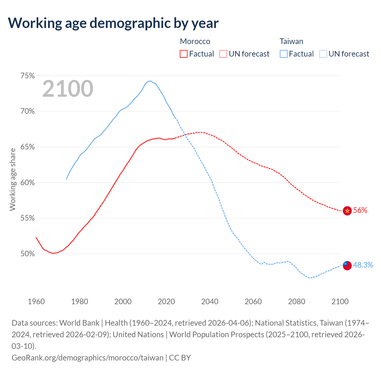 - Morocco has 25.7M working age adults (aged 15-64) vs 16.1M in Taiwan.