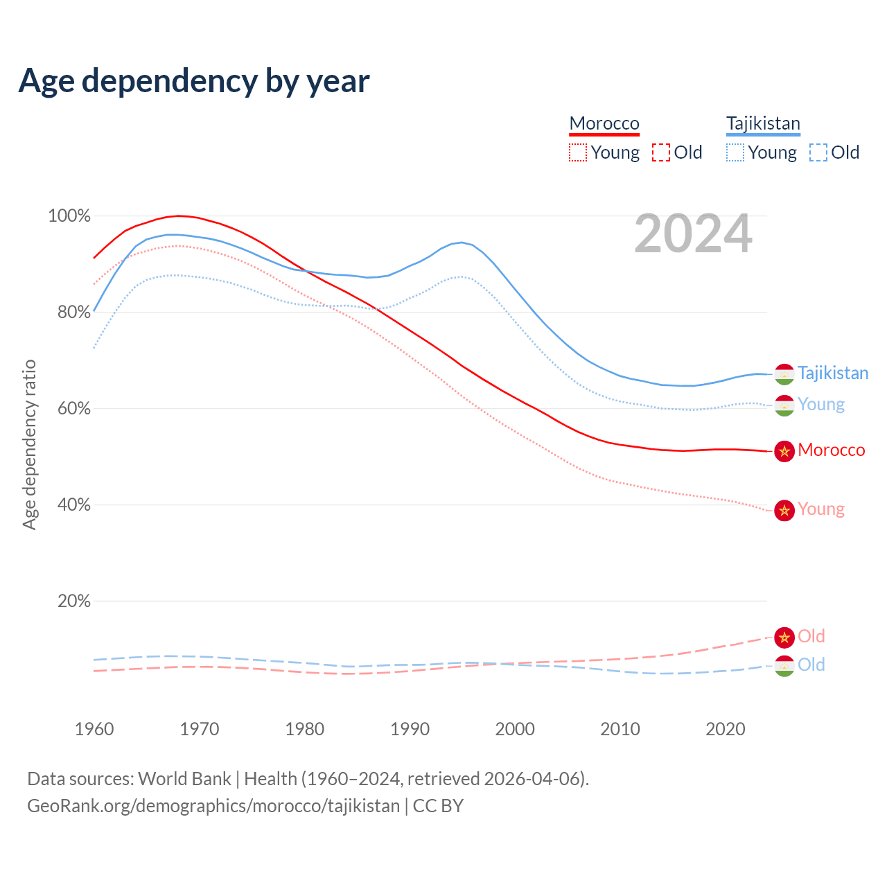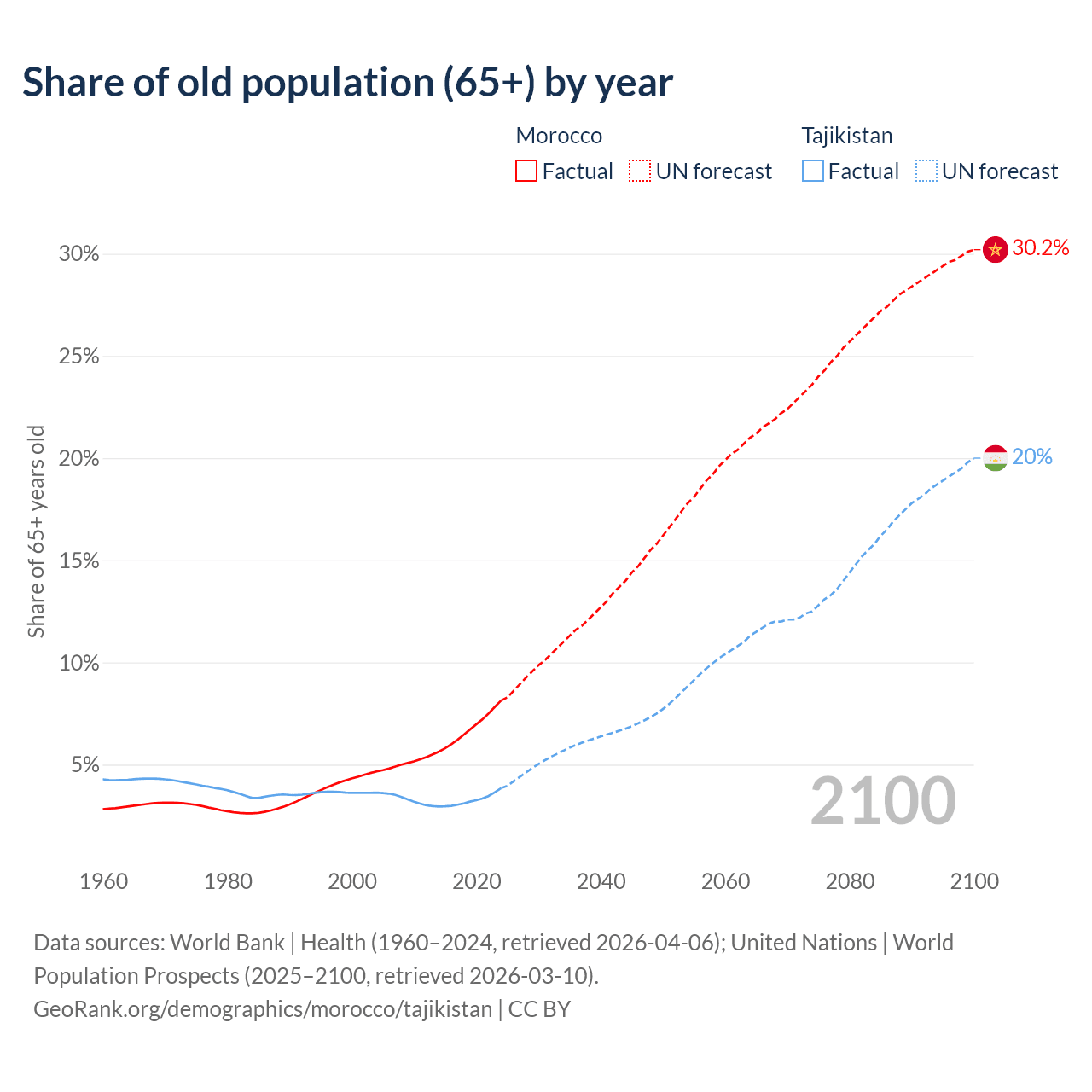 - The share of old-age demographic (65+) in Morocco is 8.14% vs 3.85% in Tajikistan.
