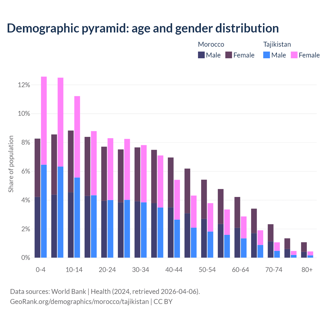 - As of 2026, the population of Morocco is 38.9M vs 11M in Tajikistan - 3.52 times difference.