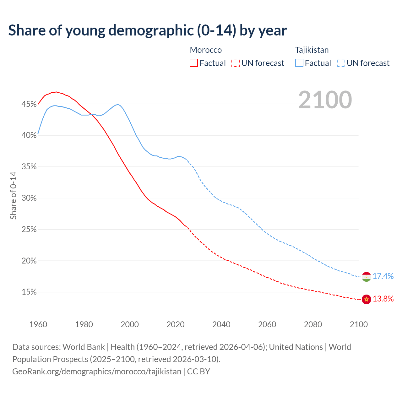 - Morocco is ranked 100/196 by median age (oldest to youngest) vs 142/196 for Tajikistan.