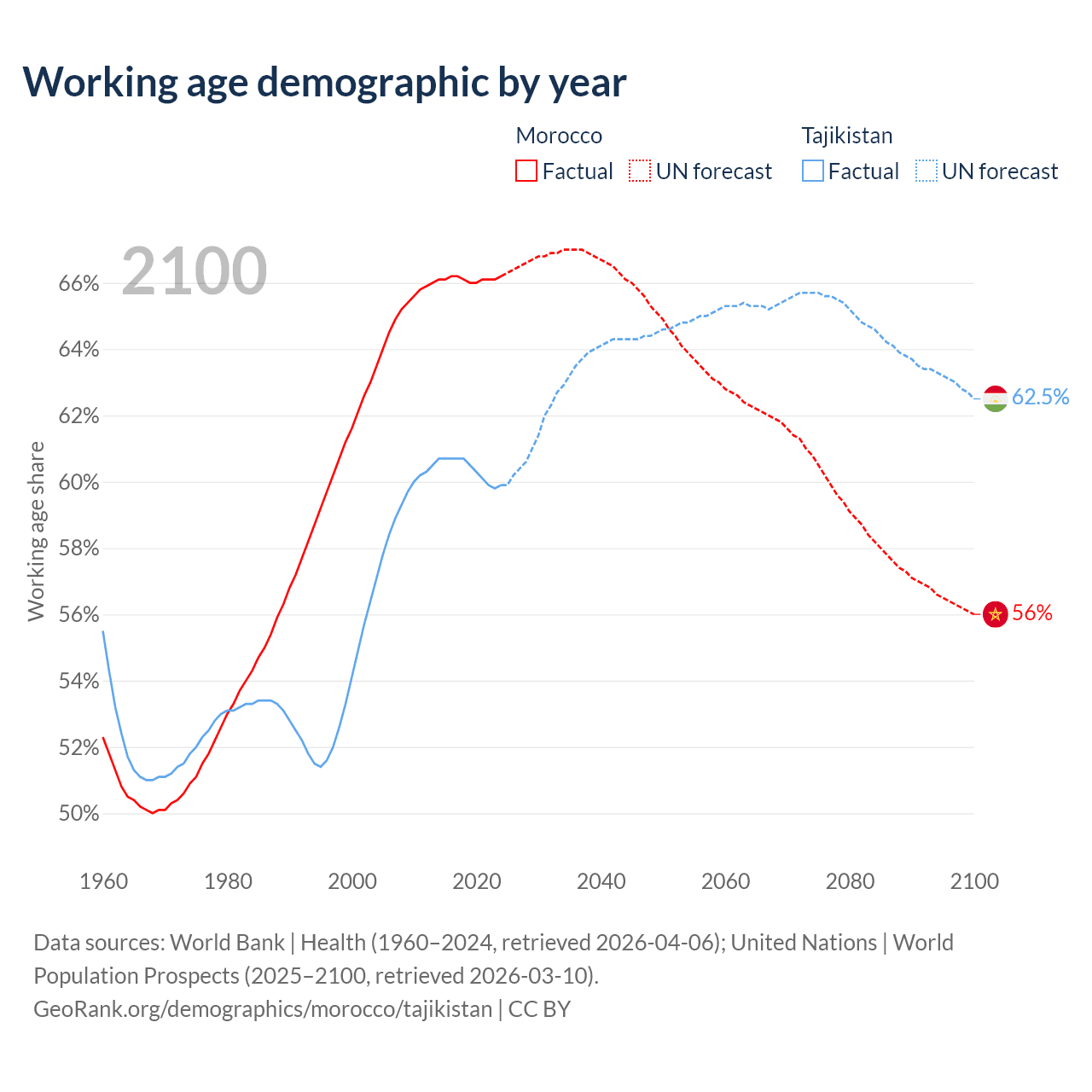 - Morocco has 25.7M working age adults (aged 15-64) vs 6.61M in Tajikistan.