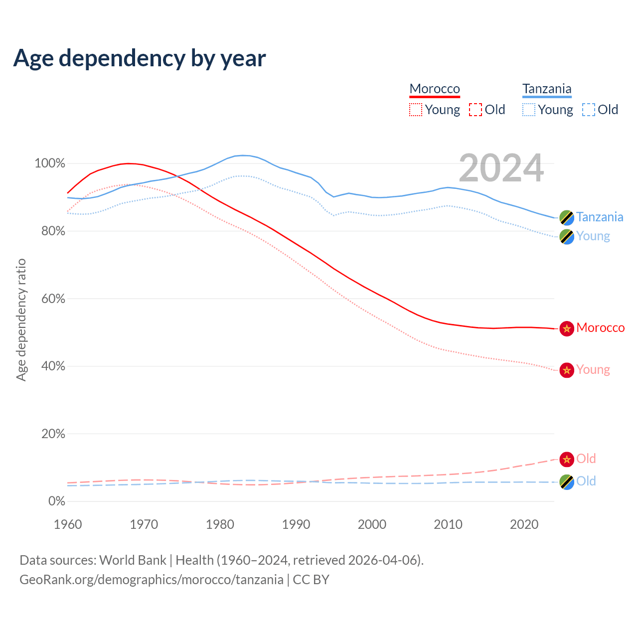 - Morocco is ranked 100/196 by median age (oldest to youngest) vs 184/196 for Tanzania.