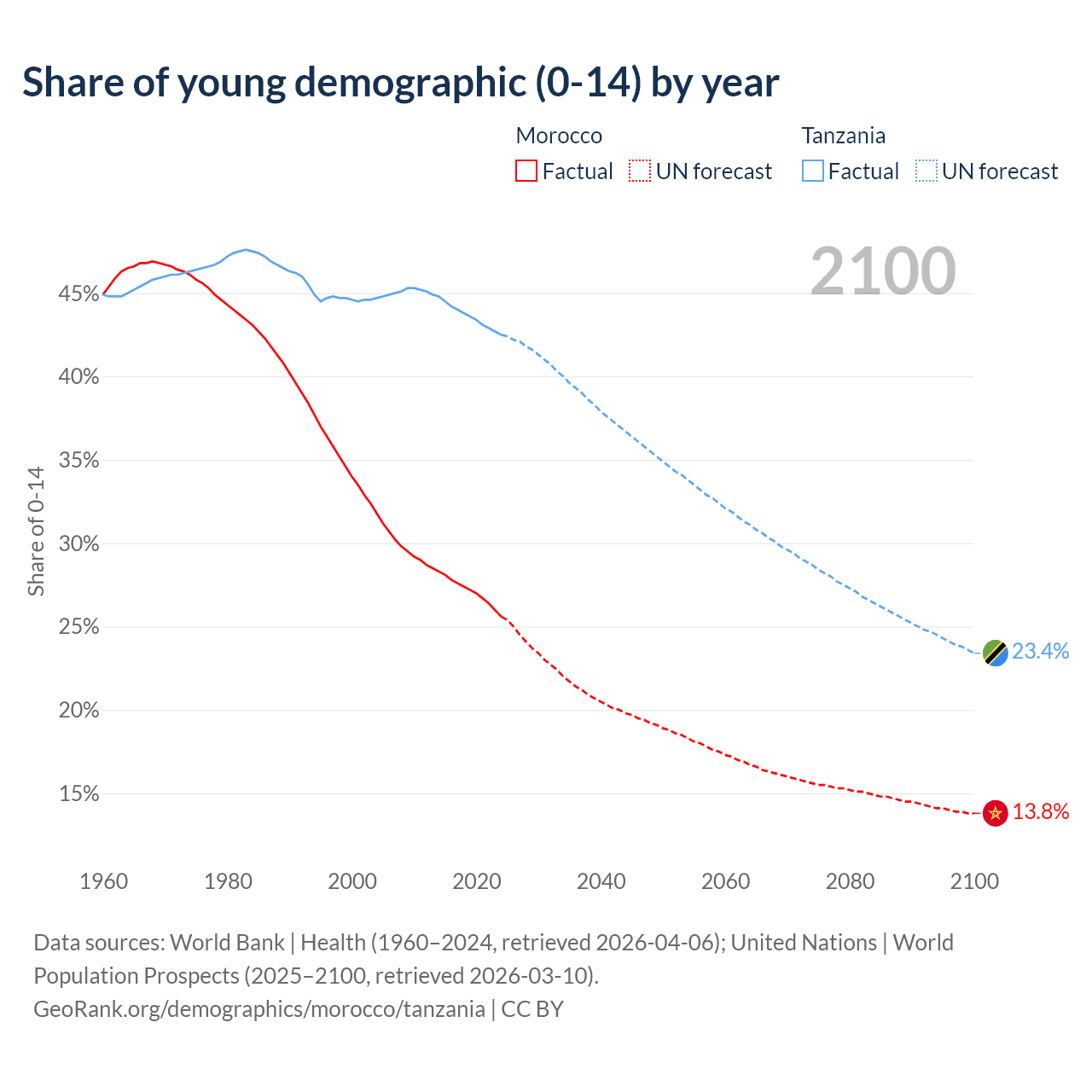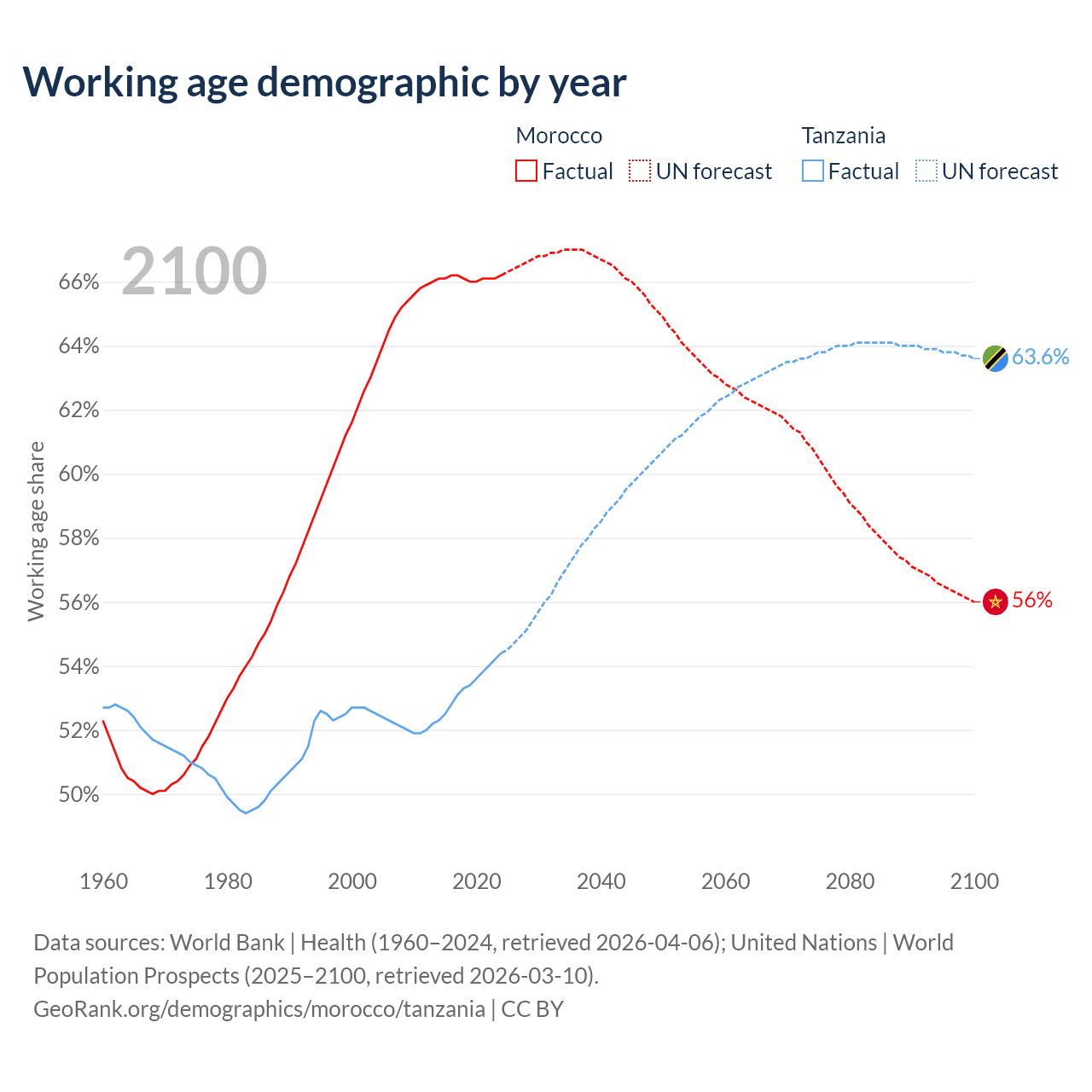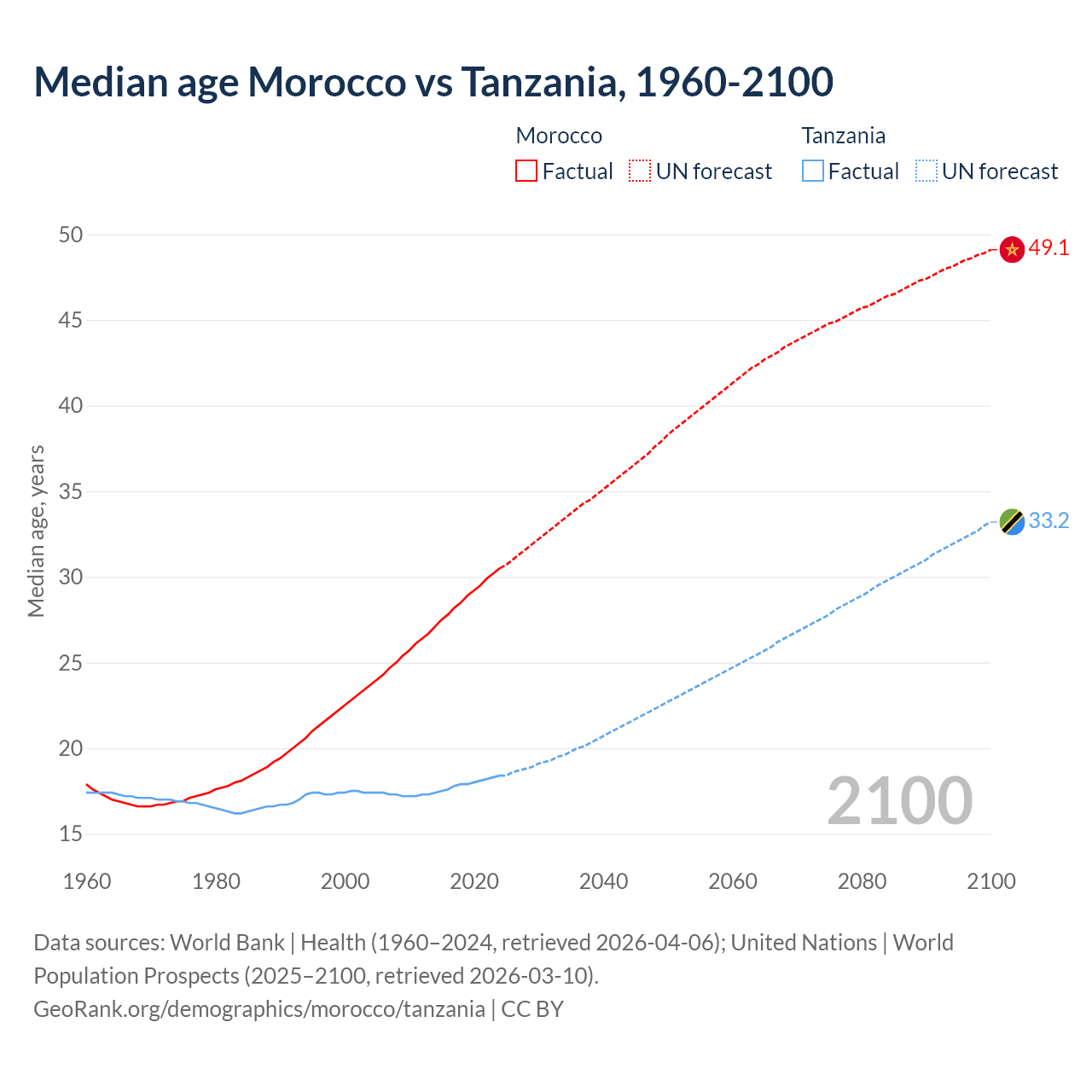 Median age Morocco vs Tanzania, 1960-2100