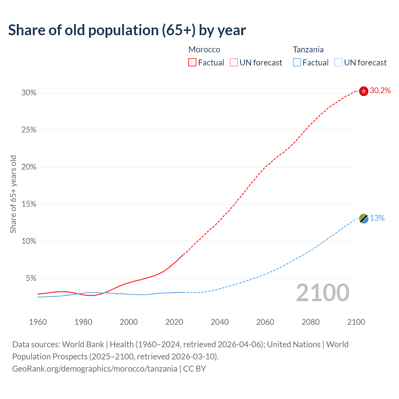 The share of older people aged 65 and over is 8.14% in Morocco and 3.05% in Tanzania. Life expectancy in Morocco compared to Tanzania .